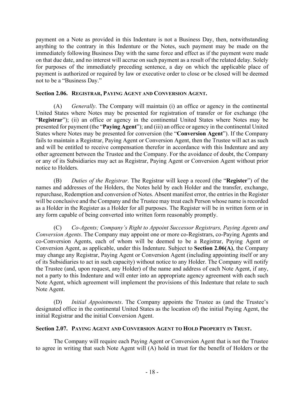 - 18 - payment on a Note as provided in this Indenture is not a Business Day, then, notwithstanding anything to the contrary in this Indenture or the Notes, such payment may be made on the immediately following Business Day with the same force and effect as if the payment were made on that due date, and no interest will accrue on such payment as a result of the related delay. Solely for purposes of the immediately preceding sentence, a day on which the applicable place of payment is authorized or required by law or executive order to close or be closed will be deemed not to be a “Business Day.” Section 2.06. REGISTRAR, PAYING AGENT AND CONVERSION AGENT. (A) Generally. The Company will maintain (i) an office or agency in the continental United States where Notes may be presented for registration of transfer or for exchange (the “Registrar”); (ii) an office or agency in the continental United States where Notes may be presented for payment (the “Paying Agent”); and (iii) an office or agency in the continental United States where Notes may be presented for conversion (the “Conversion Agent”). If the Company fails to maintain a Registrar, Paying Agent or Conversion Agent, then the Trustee will act as such and will be entitled to receive compensation therefor in accordance with this Indenture and any other agreement between the Trustee and the Company. For the avoidance of doubt, the Company or any of its Subsidiaries may act as Registrar, Paying Agent or Conversion Agent without prior notice to Holders. (B) Duties of the Registrar. The Registrar will keep a record (the “Register”) of the names and addresses of the Holders, the Notes held by each Holder and the transfer, exchange, repurchase, Redemption and conversion of Notes. Absent manifest error, the entries in the Register will be conclusive and the Company and the Trustee may treat each Person whose name is recorded as a Holder in the Register as a Holder for all purposes. The Register will be in written form or in any form capable of being converted into written form reasonably promptly. (C) Co-Agents; Company’s Right to Appoint Successor Registrars, Paying Agents and Conversion Agents. The Company may appoint one or more co-Registrars, co-Paying Agents and co-Conversion Agents, each of whom will be deemed to be a Registrar, Paying Agent or Conversion Agent, as applicable, under this Indenture. Subject to Section 2.06(A), the Company may change any Registrar, Paying Agent or Conversion Agent (including appointing itself or any of its Subsidiaries to act in such capacity) without notice to any Holder. The Company will notify the Trustee (and, upon request, any Holder) of the name and address of each Note Agent, if any, not a party to this Indenture and will enter into an appropriate agency agreement with each such Note Agent, which agreement will implement the provisions of this Indenture that relate to such Note Agent. (D) Initial Appointments. The Company appoints the Trustee as (and the Trustee’s designated office in the continental United States as the location of) the initial Paying Agent, the initial Registrar and the initial Conversion Agent. Section 2.07. PAYING AGENT AND CONVERSION AGENT TO HOLD PROPERTY IN TRUST. The Company will require each Paying Agent or Conversion Agent that is not the Trustee to agree in writing that such Note Agent will (A) hold in trust for the benefit of Holders or the