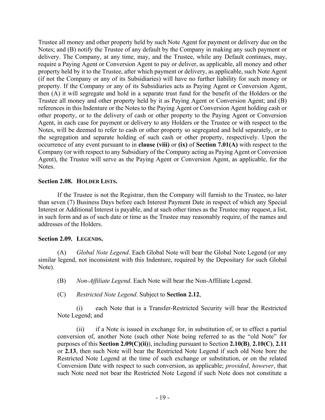 - 19 - Trustee all money and other property held by such Note Agent for payment or delivery due on the Notes; and (B) notify the Trustee of any default by the Company in making any such payment or delivery. The Company, at any time, may, and the Trustee, while any Default continues, may, require a Paying Agent or Conversion Agent to pay or deliver, as applicable, all money and other property held by it to the Trustee, after which payment or delivery, as applicable, such Note Agent (if not the Company or any of its Subsidiaries) will have no further liability for such money or property. If the Company or any of its Subsidiaries acts as Paying Agent or Conversion Agent, then (A) it will segregate and hold in a separate trust fund for the benefit of the Holders or the Trustee all money and other property held by it as Paying Agent or Conversion Agent; and (B) references in this Indenture or the Notes to the Paying Agent or Conversion Agent holding cash or other property, or to the delivery of cash or other property to the Paying Agent or Conversion Agent, in each case for payment or delivery to any Holders or the Trustee or with respect to the Notes, will be deemed to refer to cash or other property so segregated and held separately, or to the segregation and separate holding of such cash or other property, respectively. Upon the occurrence of any event pursuant to in clause (viii) or (ix) of Section 7.01(A) with respect to the Company (or with respect to any Subsidiary of the Company acting as Paying Agent or Conversion Agent), the Trustee will serve as the Paying Agent or Conversion Agent, as applicable, for the Notes. Section 2.08. HOLDER LISTS. If the Trustee is not the Registrar, then the Company will furnish to the Trustee, no later than seven (7) Business Days before each Interest Payment Date in respect of which any Special Interest or Additional Interest is payable, and at such other times as the Trustee may request, a list, in such form and as of such date or time as the Trustee may reasonably require, of the names and addresses of the Holders. Section 2.09. LEGENDS. (A) Global Note Legend. Each Global Note will bear the Global Note Legend (or any similar legend, not inconsistent with this Indenture, required by the Depositary for such Global Note). (B) Non-Affiliate Legend. Each Note will bear the Non-Affiliate Legend. (C) Restricted Note Legend. Subject to Section 2.12, (i) each Note that is a Transfer-Restricted Security will bear the Restricted Note Legend; and (ii) if a Note is issued in exchange for, in substitution of, or to effect a partial conversion of, another Note (such other Note being referred to as the “old Note” for purposes of this Section 2.09(C)(ii)), including pursuant to Section 2.10(B), 2.10(C), 2.11 or 2.13, then such Note will bear the Restricted Note Legend if such old Note bore the Restricted Note Legend at the time of such exchange or substitution, or on the related Conversion Date with respect to such conversion, as applicable; provided, however, that such Note need not bear the Restricted Note Legend if such Note does not constitute a