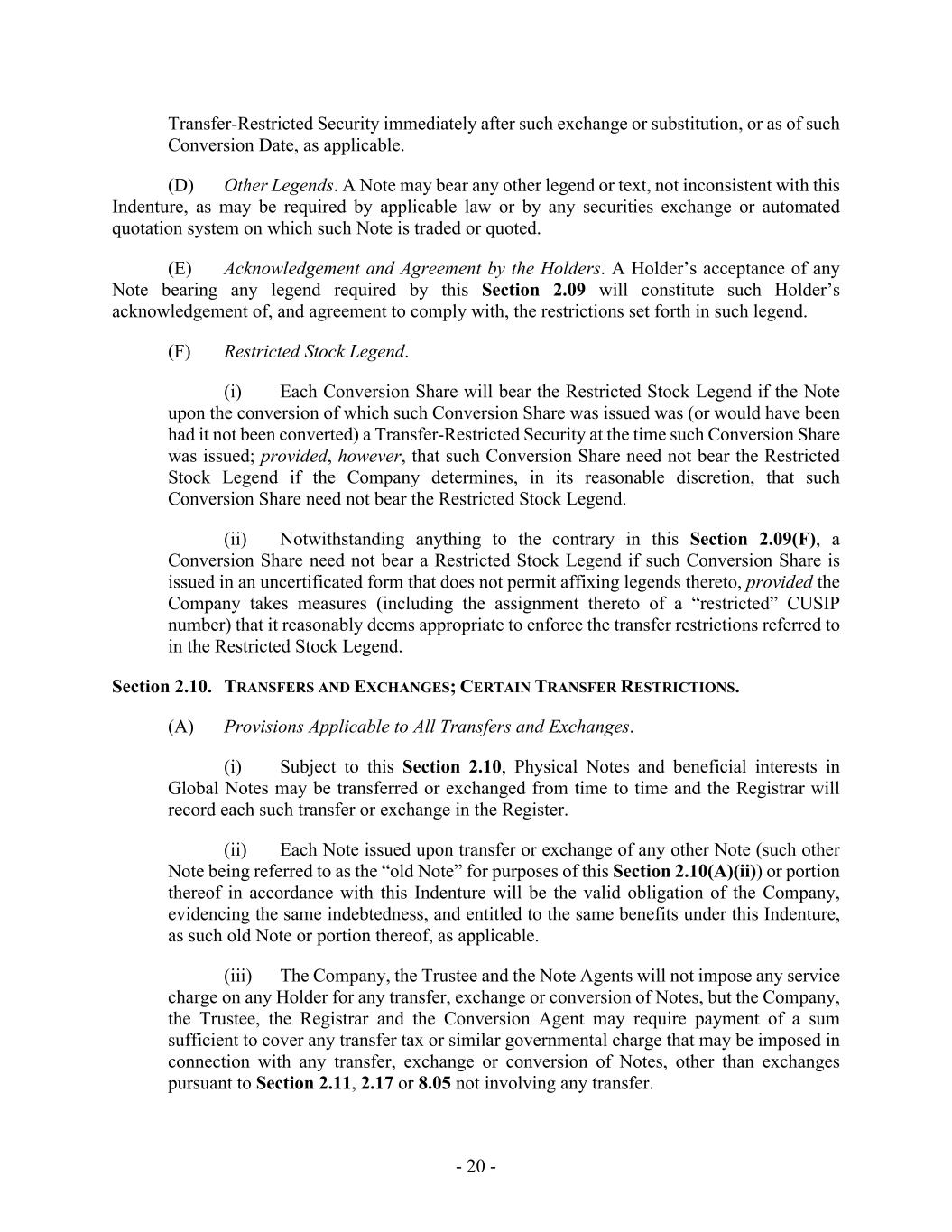 - 20 - Transfer-Restricted Security immediately after such exchange or substitution, or as of such Conversion Date, as applicable. (D) Other Legends. A Note may bear any other legend or text, not inconsistent with this Indenture, as may be required by applicable law or by any securities exchange or automated quotation system on which such Note is traded or quoted. (E) Acknowledgement and Agreement by the Holders. A Holder’s acceptance of any Note bearing any legend required by this Section 2.09 will constitute such Holder’s acknowledgement of, and agreement to comply with, the restrictions set forth in such legend. (F) Restricted Stock Legend. (i) Each Conversion Share will bear the Restricted Stock Legend if the Note upon the conversion of which such Conversion Share was issued was (or would have been had it not been converted) a Transfer-Restricted Security at the time such Conversion Share was issued; provided, however, that such Conversion Share need not bear the Restricted Stock Legend if the Company determines, in its reasonable discretion, that such Conversion Share need not bear the Restricted Stock Legend. (ii) Notwithstanding anything to the contrary in this Section 2.09(F), a Conversion Share need not bear a Restricted Stock Legend if such Conversion Share is issued in an uncertificated form that does not permit affixing legends thereto, provided the Company takes measures (including the assignment thereto of a “restricted” CUSIP number) that it reasonably deems appropriate to enforce the transfer restrictions referred to in the Restricted Stock Legend. Section 2.10. TRANSFERS AND EXCHANGES; CERTAIN TRANSFER RESTRICTIONS. (A) Provisions Applicable to All Transfers and Exchanges. (i) Subject to this Section 2.10, Physical Notes and beneficial interests in Global Notes may be transferred or exchanged from time to time and the Registrar will record each such transfer or exchange in the Register. (ii) Each Note issued upon transfer or exchange of any other Note (such other Note being referred to as the “old Note” for purposes of this Section 2.10(A)(ii)) or portion thereof in accordance with this Indenture will be the valid obligation of the Company, evidencing the same indebtedness, and entitled to the same benefits under this Indenture, as such old Note or portion thereof, as applicable. (iii) The Company, the Trustee and the Note Agents will not impose any service charge on any Holder for any transfer, exchange or conversion of Notes, but the Company, the Trustee, the Registrar and the Conversion Agent may require payment of a sum sufficient to cover any transfer tax or similar governmental charge that may be imposed in connection with any transfer, exchange or conversion of Notes, other than exchanges pursuant to Section 2.11, 2.17 or 8.05 not involving any transfer.