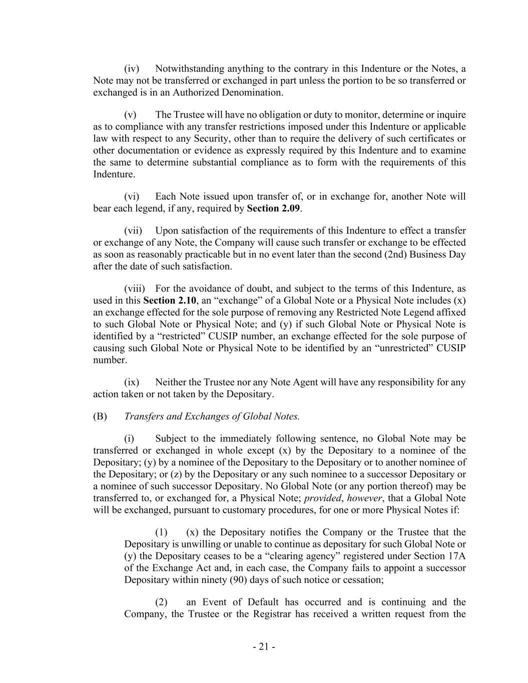 - 21 - (iv) Notwithstanding anything to the contrary in this Indenture or the Notes, a Note may not be transferred or exchanged in part unless the portion to be so transferred or exchanged is in an Authorized Denomination. (v) The Trustee will have no obligation or duty to monitor, determine or inquire as to compliance with any transfer restrictions imposed under this Indenture or applicable law with respect to any Security, other than to require the delivery of such certificates or other documentation or evidence as expressly required by this Indenture and to examine the same to determine substantial compliance as to form with the requirements of this Indenture. (vi) Each Note issued upon transfer of, or in exchange for, another Note will bear each legend, if any, required by Section 2.09. (vii) Upon satisfaction of the requirements of this Indenture to effect a transfer or exchange of any Note, the Company will cause such transfer or exchange to be effected as soon as reasonably practicable but in no event later than the second (2nd) Business Day after the date of such satisfaction. (viii) For the avoidance of doubt, and subject to the terms of this Indenture, as used in this Section 2.10, an “exchange” of a Global Note or a Physical Note includes (x) an exchange effected for the sole purpose of removing any Restricted Note Legend affixed to such Global Note or Physical Note; and (y) if such Global Note or Physical Note is identified by a “restricted” CUSIP number, an exchange effected for the sole purpose of causing such Global Note or Physical Note to be identified by an “unrestricted” CUSIP number. (ix) Neither the Trustee nor any Note Agent will have any responsibility for any action taken or not taken by the Depositary. (B) Transfers and Exchanges of Global Notes. (i) Subject to the immediately following sentence, no Global Note may be transferred or exchanged in whole except (x) by the Depositary to a nominee of the Depositary; (y) by a nominee of the Depositary to the Depositary or to another nominee of the Depositary; or (z) by the Depositary or any such nominee to a successor Depositary or a nominee of such successor Depositary. No Global Note (or any portion thereof) may be transferred to, or exchanged for, a Physical Note; provided, however, that a Global Note will be exchanged, pursuant to customary procedures, for one or more Physical Notes if: (1) (x) the Depositary notifies the Company or the Trustee that the Depositary is unwilling or unable to continue as depositary for such Global Note or (y) the Depositary ceases to be a “clearing agency” registered under Section 17A of the Exchange Act and, in each case, the Company fails to appoint a successor Depositary within ninety (90) days of such notice or cessation; (2) an Event of Default has occurred and is continuing and the Company, the Trustee or the Registrar has received a written request from the
