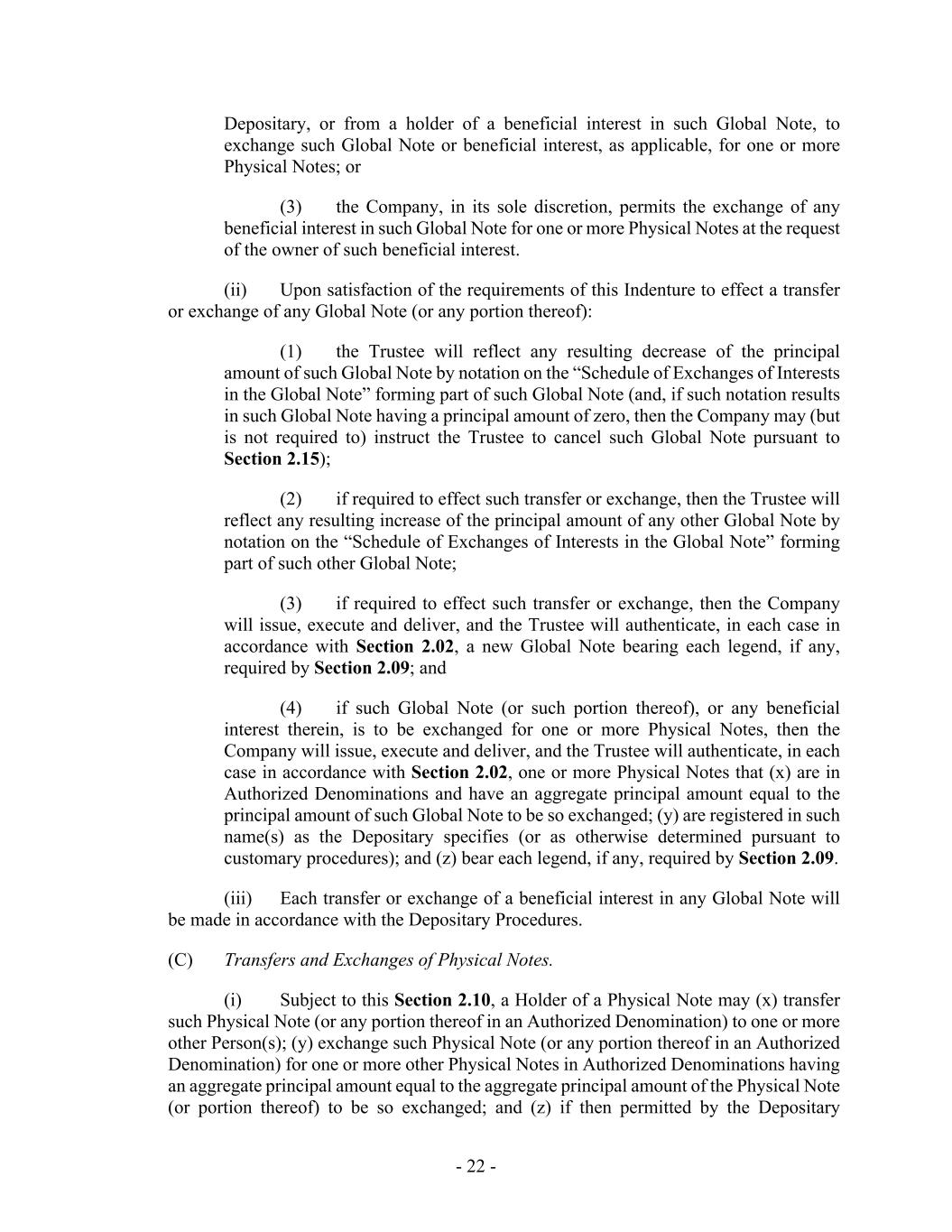 - 22 - Depositary, or from a holder of a beneficial interest in such Global Note, to exchange such Global Note or beneficial interest, as applicable, for one or more Physical Notes; or (3) the Company, in its sole discretion, permits the exchange of any beneficial interest in such Global Note for one or more Physical Notes at the request of the owner of such beneficial interest. (ii) Upon satisfaction of the requirements of this Indenture to effect a transfer or exchange of any Global Note (or any portion thereof): (1) the Trustee will reflect any resulting decrease of the principal amount of such Global Note by notation on the “Schedule of Exchanges of Interests in the Global Note” forming part of such Global Note (and, if such notation results in such Global Note having a principal amount of zero, then the Company may (but is not required to) instruct the Trustee to cancel such Global Note pursuant to Section 2.15); (2) if required to effect such transfer or exchange, then the Trustee will reflect any resulting increase of the principal amount of any other Global Note by notation on the “Schedule of Exchanges of Interests in the Global Note” forming part of such other Global Note; (3) if required to effect such transfer or exchange, then the Company will issue, execute and deliver, and the Trustee will authenticate, in each case in accordance with Section 2.02, a new Global Note bearing each legend, if any, required by Section 2.09; and (4) if such Global Note (or such portion thereof), or any beneficial interest therein, is to be exchanged for one or more Physical Notes, then the Company will issue, execute and deliver, and the Trustee will authenticate, in each case in accordance with Section 2.02, one or more Physical Notes that (x) are in Authorized Denominations and have an aggregate principal amount equal to the principal amount of such Global Note to be so exchanged; (y) are registered in such name(s) as the Depositary specifies (or as otherwise determined pursuant to customary procedures); and (z) bear each legend, if any, required by Section 2.09. (iii) Each transfer or exchange of a beneficial interest in any Global Note will be made in accordance with the Depositary Procedures. (C) Transfers and Exchanges of Physical Notes. (i) Subject to this Section 2.10, a Holder of a Physical Note may (x) transfer such Physical Note (or any portion thereof in an Authorized Denomination) to one or more other Person(s); (y) exchange such Physical Note (or any portion thereof in an Authorized Denomination) for one or more other Physical Notes in Authorized Denominations having an aggregate principal amount equal to the aggregate principal amount of the Physical Note (or portion thereof) to be so exchanged; and (z) if then permitted by the Depositary