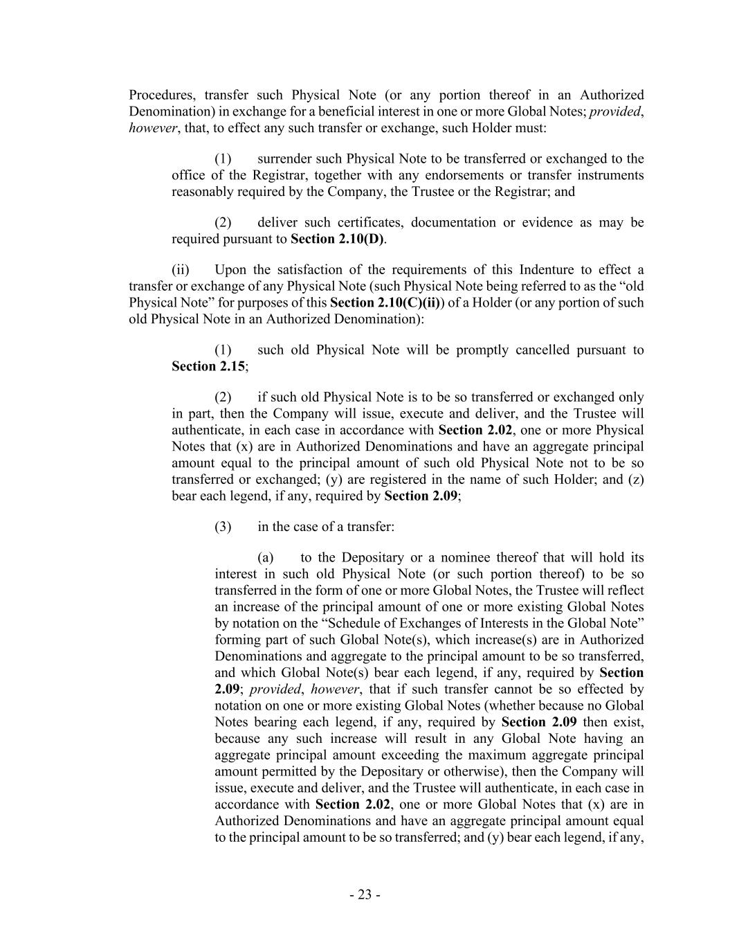 - 23 - Procedures, transfer such Physical Note (or any portion thereof in an Authorized Denomination) in exchange for a beneficial interest in one or more Global Notes; provided, however, that, to effect any such transfer or exchange, such Holder must: (1) surrender such Physical Note to be transferred or exchanged to the office of the Registrar, together with any endorsements or transfer instruments reasonably required by the Company, the Trustee or the Registrar; and (2) deliver such certificates, documentation or evidence as may be required pursuant to Section 2.10(D). (ii) Upon the satisfaction of the requirements of this Indenture to effect a transfer or exchange of any Physical Note (such Physical Note being referred to as the “old Physical Note” for purposes of this Section 2.10(C)(ii)) of a Holder (or any portion of such old Physical Note in an Authorized Denomination): (1) such old Physical Note will be promptly cancelled pursuant to Section 2.15; (2) if such old Physical Note is to be so transferred or exchanged only in part, then the Company will issue, execute and deliver, and the Trustee will authenticate, in each case in accordance with Section 2.02, one or more Physical Notes that (x) are in Authorized Denominations and have an aggregate principal amount equal to the principal amount of such old Physical Note not to be so transferred or exchanged; (y) are registered in the name of such Holder; and (z) bear each legend, if any, required by Section 2.09; (3) in the case of a transfer: (a) to the Depositary or a nominee thereof that will hold its interest in such old Physical Note (or such portion thereof) to be so transferred in the form of one or more Global Notes, the Trustee will reflect an increase of the principal amount of one or more existing Global Notes by notation on the “Schedule of Exchanges of Interests in the Global Note” forming part of such Global Note(s), which increase(s) are in Authorized Denominations and aggregate to the principal amount to be so transferred, and which Global Note(s) bear each legend, if any, required by Section 2.09; provided, however, that if such transfer cannot be so effected by notation on one or more existing Global Notes (whether because no Global Notes bearing each legend, if any, required by Section 2.09 then exist, because any such increase will result in any Global Note having an aggregate principal amount exceeding the maximum aggregate principal amount permitted by the Depositary or otherwise), then the Company will issue, execute and deliver, and the Trustee will authenticate, in each case in accordance with Section 2.02, one or more Global Notes that (x) are in Authorized Denominations and have an aggregate principal amount equal to the principal amount to be so transferred; and (y) bear each legend, if any,