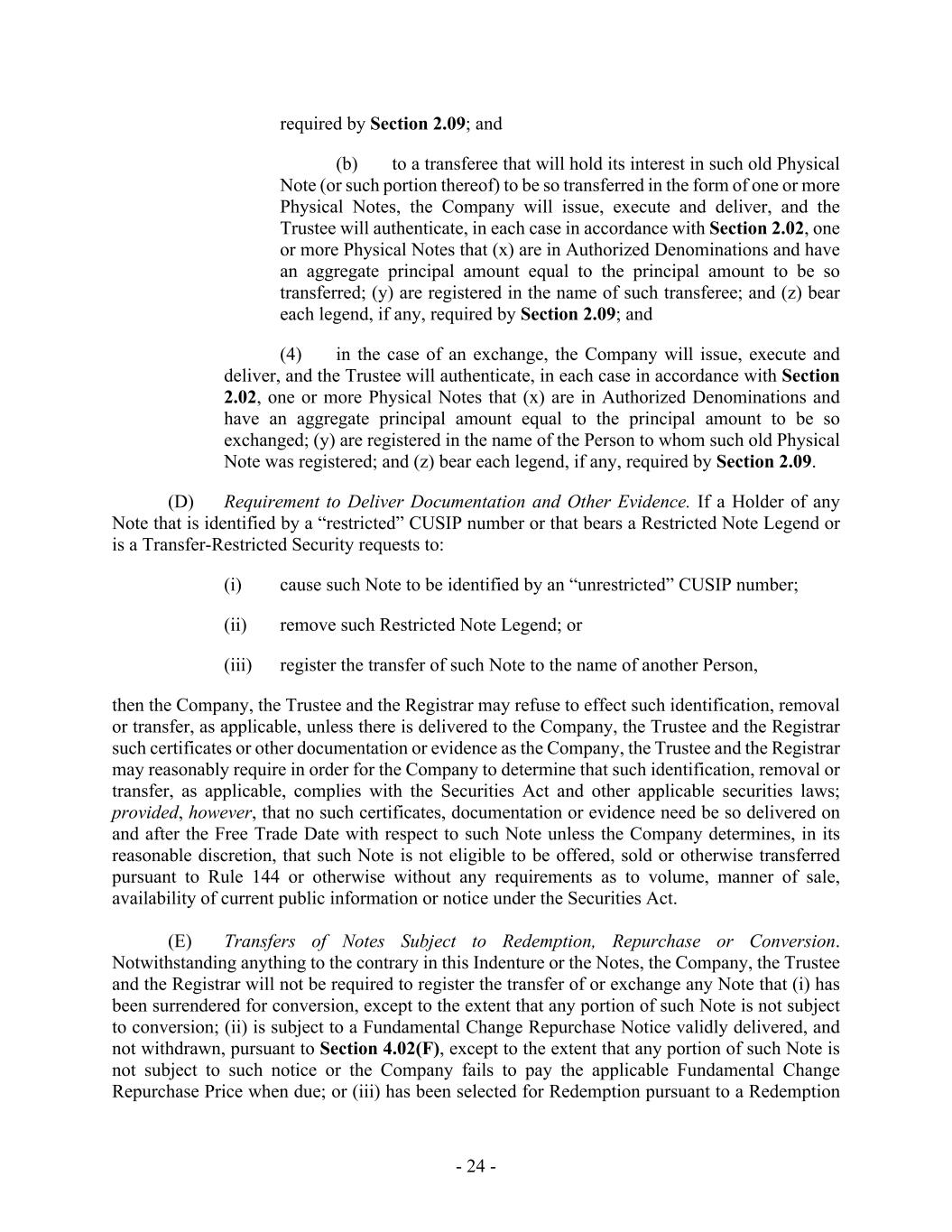 - 24 - required by Section 2.09; and (b) to a transferee that will hold its interest in such old Physical Note (or such portion thereof) to be so transferred in the form of one or more Physical Notes, the Company will issue, execute and deliver, and the Trustee will authenticate, in each case in accordance with Section 2.02, one or more Physical Notes that (x) are in Authorized Denominations and have an aggregate principal amount equal to the principal amount to be so transferred; (y) are registered in the name of such transferee; and (z) bear each legend, if any, required by Section 2.09; and (4) in the case of an exchange, the Company will issue, execute and deliver, and the Trustee will authenticate, in each case in accordance with Section 2.02, one or more Physical Notes that (x) are in Authorized Denominations and have an aggregate principal amount equal to the principal amount to be so exchanged; (y) are registered in the name of the Person to whom such old Physical Note was registered; and (z) bear each legend, if any, required by Section 2.09. (D) Requirement to Deliver Documentation and Other Evidence. If a Holder of any Note that is identified by a “restricted” CUSIP number or that bears a Restricted Note Legend or is a Transfer-Restricted Security requests to: (i) cause such Note to be identified by an “unrestricted” CUSIP number; (ii) remove such Restricted Note Legend; or (iii) register the transfer of such Note to the name of another Person, then the Company, the Trustee and the Registrar may refuse to effect such identification, removal or transfer, as applicable, unless there is delivered to the Company, the Trustee and the Registrar such certificates or other documentation or evidence as the Company, the Trustee and the Registrar may reasonably require in order for the Company to determine that such identification, removal or transfer, as applicable, complies with the Securities Act and other applicable securities laws; provided, however, that no such certificates, documentation or evidence need be so delivered on and after the Free Trade Date with respect to such Note unless the Company determines, in its reasonable discretion, that such Note is not eligible to be offered, sold or otherwise transferred pursuant to Rule 144 or otherwise without any requirements as to volume, manner of sale, availability of current public information or notice under the Securities Act. (E) Transfers of Notes Subject to Redemption, Repurchase or Conversion. Notwithstanding anything to the contrary in this Indenture or the Notes, the Company, the Trustee and the Registrar will not be required to register the transfer of or exchange any Note that (i) has been surrendered for conversion, except to the extent that any portion of such Note is not subject to conversion; (ii) is subject to a Fundamental Change Repurchase Notice validly delivered, and not withdrawn, pursuant to Section 4.02(F), except to the extent that any portion of such Note is not subject to such notice or the Company fails to pay the applicable Fundamental Change Repurchase Price when due; or (iii) has been selected for Redemption pursuant to a Redemption