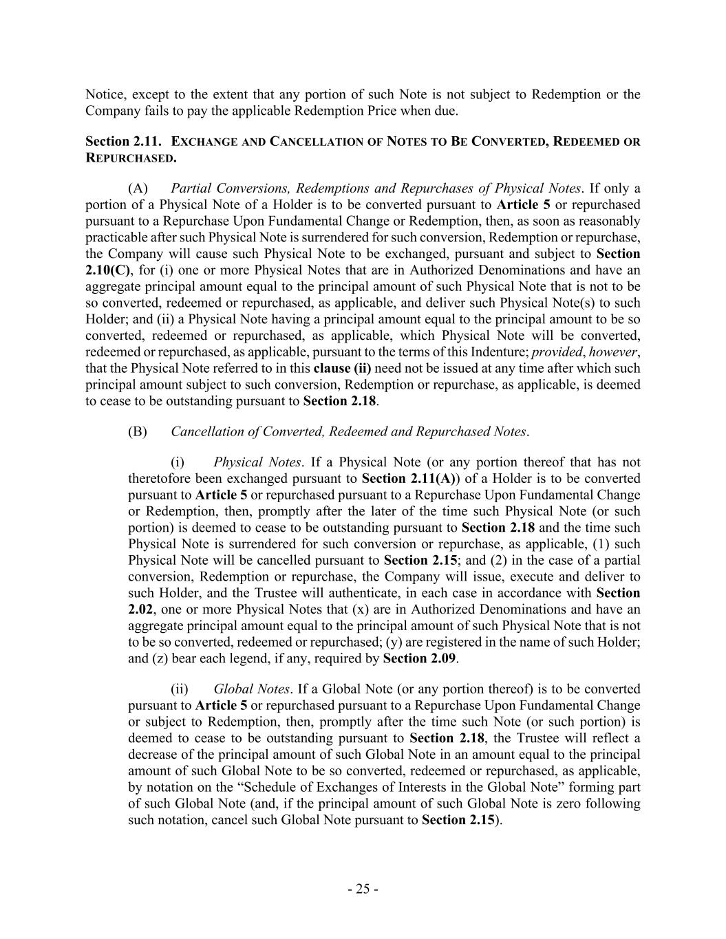 - 25 - Notice, except to the extent that any portion of such Note is not subject to Redemption or the Company fails to pay the applicable Redemption Price when due. Section 2.11. EXCHANGE AND CANCELLATION OF NOTES TO BE CONVERTED, REDEEMED OR REPURCHASED. (A) Partial Conversions, Redemptions and Repurchases of Physical Notes. If only a portion of a Physical Note of a Holder is to be converted pursuant to Article 5 or repurchased pursuant to a Repurchase Upon Fundamental Change or Redemption, then, as soon as reasonably practicable after such Physical Note is surrendered for such conversion, Redemption or repurchase, the Company will cause such Physical Note to be exchanged, pursuant and subject to Section 2.10(C), for (i) one or more Physical Notes that are in Authorized Denominations and have an aggregate principal amount equal to the principal amount of such Physical Note that is not to be so converted, redeemed or repurchased, as applicable, and deliver such Physical Note(s) to such Holder; and (ii) a Physical Note having a principal amount equal to the principal amount to be so converted, redeemed or repurchased, as applicable, which Physical Note will be converted, redeemed or repurchased, as applicable, pursuant to the terms of this Indenture; provided, however, that the Physical Note referred to in this clause (ii) need not be issued at any time after which such principal amount subject to such conversion, Redemption or repurchase, as applicable, is deemed to cease to be outstanding pursuant to Section 2.18. (B) Cancellation of Converted, Redeemed and Repurchased Notes. (i) Physical Notes. If a Physical Note (or any portion thereof that has not theretofore been exchanged pursuant to Section 2.11(A)) of a Holder is to be converted pursuant to Article 5 or repurchased pursuant to a Repurchase Upon Fundamental Change or Redemption, then, promptly after the later of the time such Physical Note (or such portion) is deemed to cease to be outstanding pursuant to Section 2.18 and the time such Physical Note is surrendered for such conversion or repurchase, as applicable, (1) such Physical Note will be cancelled pursuant to Section 2.15; and (2) in the case of a partial conversion, Redemption or repurchase, the Company will issue, execute and deliver to such Holder, and the Trustee will authenticate, in each case in accordance with Section 2.02, one or more Physical Notes that (x) are in Authorized Denominations and have an aggregate principal amount equal to the principal amount of such Physical Note that is not to be so converted, redeemed or repurchased; (y) are registered in the name of such Holder; and (z) bear each legend, if any, required by Section 2.09. (ii) Global Notes. If a Global Note (or any portion thereof) is to be converted pursuant to Article 5 or repurchased pursuant to a Repurchase Upon Fundamental Change or subject to Redemption, then, promptly after the time such Note (or such portion) is deemed to cease to be outstanding pursuant to Section 2.18, the Trustee will reflect a decrease of the principal amount of such Global Note in an amount equal to the principal amount of such Global Note to be so converted, redeemed or repurchased, as applicable, by notation on the “Schedule of Exchanges of Interests in the Global Note” forming part of such Global Note (and, if the principal amount of such Global Note is zero following such notation, cancel such Global Note pursuant to Section 2.15).