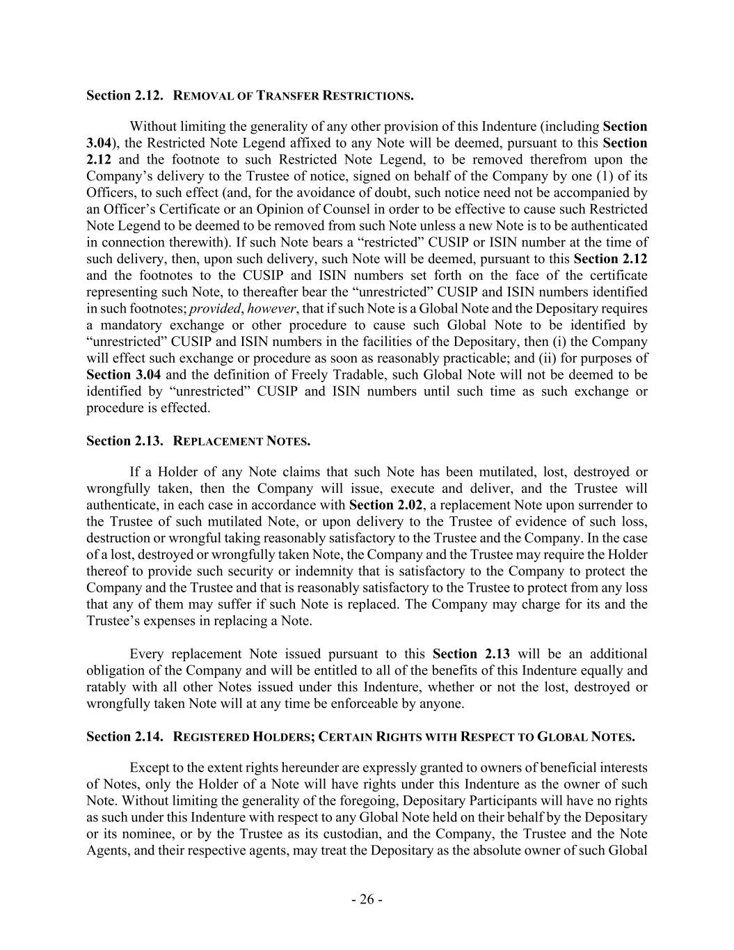 - 26 - Section 2.12. REMOVAL OF TRANSFER RESTRICTIONS. Without limiting the generality of any other provision of this Indenture (including Section 3.04), the Restricted Note Legend affixed to any Note will be deemed, pursuant to this Section 2.12 and the footnote to such Restricted Note Legend, to be removed therefrom upon the Company’s delivery to the Trustee of notice, signed on behalf of the Company by one (1) of its Officers, to such effect (and, for the avoidance of doubt, such notice need not be accompanied by an Officer’s Certificate or an Opinion of Counsel in order to be effective to cause such Restricted Note Legend to be deemed to be removed from such Note unless a new Note is to be authenticated in connection therewith). If such Note bears a “restricted” CUSIP or ISIN number at the time of such delivery, then, upon such delivery, such Note will be deemed, pursuant to this Section 2.12 and the footnotes to the CUSIP and ISIN numbers set forth on the face of the certificate representing such Note, to thereafter bear the “unrestricted” CUSIP and ISIN numbers identified in such footnotes; provided, however, that if such Note is a Global Note and the Depositary requires a mandatory exchange or other procedure to cause such Global Note to be identified by “unrestricted” CUSIP and ISIN numbers in the facilities of the Depositary, then (i) the Company will effect such exchange or procedure as soon as reasonably practicable; and (ii) for purposes of Section 3.04 and the definition of Freely Tradable, such Global Note will not be deemed to be identified by “unrestricted” CUSIP and ISIN numbers until such time as such exchange or procedure is effected. Section 2.13. REPLACEMENT NOTES. If a Holder of any Note claims that such Note has been mutilated, lost, destroyed or wrongfully taken, then the Company will issue, execute and deliver, and the Trustee will authenticate, in each case in accordance with Section 2.02, a replacement Note upon surrender to the Trustee of such mutilated Note, or upon delivery to the Trustee of evidence of such loss, destruction or wrongful taking reasonably satisfactory to the Trustee and the Company. In the case of a lost, destroyed or wrongfully taken Note, the Company and the Trustee may require the Holder thereof to provide such security or indemnity that is satisfactory to the Company to protect the Company and the Trustee and that is reasonably satisfactory to the Trustee to protect from any loss that any of them may suffer if such Note is replaced. The Company may charge for its and the Trustee’s expenses in replacing a Note. Every replacement Note issued pursuant to this Section 2.13 will be an additional obligation of the Company and will be entitled to all of the benefits of this Indenture equally and ratably with all other Notes issued under this Indenture, whether or not the lost, destroyed or wrongfully taken Note will at any time be enforceable by anyone. Section 2.14. REGISTERED HOLDERS; CERTAIN RIGHTS WITH RESPECT TO GLOBAL NOTES. Except to the extent rights hereunder are expressly granted to owners of beneficial interests of Notes, only the Holder of a Note will have rights under this Indenture as the owner of such Note. Without limiting the generality of the foregoing, Depositary Participants will have no rights as such under this Indenture with respect to any Global Note held on their behalf by the Depositary or its nominee, or by the Trustee as its custodian, and the Company, the Trustee and the Note Agents, and their respective agents, may treat the Depositary as the absolute owner of such Global