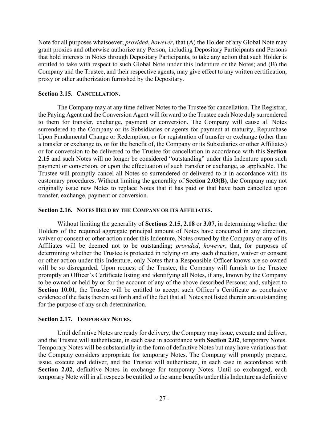- 27 - Note for all purposes whatsoever; provided, however, that (A) the Holder of any Global Note may grant proxies and otherwise authorize any Person, including Depositary Participants and Persons that hold interests in Notes through Depositary Participants, to take any action that such Holder is entitled to take with respect to such Global Note under this Indenture or the Notes; and (B) the Company and the Trustee, and their respective agents, may give effect to any written certification, proxy or other authorization furnished by the Depositary. Section 2.15. CANCELLATION. The Company may at any time deliver Notes to the Trustee for cancellation. The Registrar, the Paying Agent and the Conversion Agent will forward to the Trustee each Note duly surrendered to them for transfer, exchange, payment or conversion. The Company will cause all Notes surrendered to the Company or its Subsidiaries or agents for payment at maturity, Repurchase Upon Fundamental Change or Redemption, or for registration of transfer or exchange (other than a transfer or exchange to, or for the benefit of, the Company or its Subsidiaries or other Affiliates) or for conversion to be delivered to the Trustee for cancellation in accordance with this Section 2.15 and such Notes will no longer be considered “outstanding” under this Indenture upon such payment or conversion, or upon the effectuation of such transfer or exchange, as applicable. The Trustee will promptly cancel all Notes so surrendered or delivered to it in accordance with its customary procedures. Without limiting the generality of Section 2.03(B), the Company may not originally issue new Notes to replace Notes that it has paid or that have been cancelled upon transfer, exchange, payment or conversion. Section 2.16. NOTES HELD BY THE COMPANY OR ITS AFFILIATES. Without limiting the generality of Sections 2.15, 2.18 or 3.07, in determining whether the Holders of the required aggregate principal amount of Notes have concurred in any direction, waiver or consent or other action under this Indenture, Notes owned by the Company or any of its Affiliates will be deemed not to be outstanding; provided, however, that, for purposes of determining whether the Trustee is protected in relying on any such direction, waiver or consent or other action under this Indenture, only Notes that a Responsible Officer knows are so owned will be so disregarded. Upon request of the Trustee, the Company will furnish to the Trustee promptly an Officer’s Certificate listing and identifying all Notes, if any, known by the Company to be owned or held by or for the account of any of the above described Persons; and, subject to Section 10.01, the Trustee will be entitled to accept such Officer’s Certificate as conclusive evidence of the facts therein set forth and of the fact that all Notes not listed therein are outstanding for the purpose of any such determination. Section 2.17. TEMPORARY NOTES. Until definitive Notes are ready for delivery, the Company may issue, execute and deliver, and the Trustee will authenticate, in each case in accordance with Section 2.02, temporary Notes. Temporary Notes will be substantially in the form of definitive Notes but may have variations that the Company considers appropriate for temporary Notes. The Company will promptly prepare, issue, execute and deliver, and the Trustee will authenticate, in each case in accordance with Section 2.02, definitive Notes in exchange for temporary Notes. Until so exchanged, each temporary Note will in all respects be entitled to the same benefits under this Indenture as definitive
