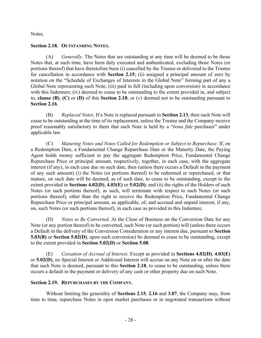- 28 - Notes. Section 2.18. OUTSTANDING NOTES. (A) Generally. The Notes that are outstanding at any time will be deemed to be those Notes that, at such time, have been duly executed and authenticated, excluding those Notes (or portions thereof) that have theretofore been (i) cancelled by the Trustee or delivered to the Trustee for cancellation in accordance with Section 2.15; (ii) assigned a principal amount of zero by notation on the “Schedule of Exchanges of Interests in the Global Note” forming part of any a Global Note representing such Note; (iii) paid in full (including upon conversion) in accordance with this Indenture; (iv) deemed to cease to be outstanding to the extent provided in, and subject to, clause (B), (C) or (D) of this Section 2.18; or (v) deemed not to be outstanding pursuant to Section 2.16. (B) Replaced Notes. If a Note is replaced pursuant to Section 2.13, then such Note will cease to be outstanding at the time of its replacement, unless the Trustee and the Company receive proof reasonably satisfactory to them that such Note is held by a “bona fide purchaser” under applicable law. (C) Maturing Notes and Notes Called for Redemption or Subject to Repurchase. If, on a Redemption Date, a Fundamental Change Repurchase Date or the Maturity Date, the Paying Agent holds money sufficient to pay the aggregate Redemption Price, Fundamental Change Repurchase Price or principal amount, respectively, together, in each case, with the aggregate interest (if any), in each case due on such date, then (unless there occurs a Default in the payment of any such amount) (i) the Notes (or portions thereof) to be redeemed or repurchased, or that mature, on such date will be deemed, as of such date, to cease to be outstanding, except to the extent provided in Sections 4.02(D), 4.03(E) or 5.02(D); and (ii) the rights of the Holders of such Notes (or such portions thereof), as such, will terminate with respect to such Notes (or such portions thereof), other than the right to receive the Redemption Price, Fundamental Change Repurchase Price or principal amount, as applicable, of, and accrued and unpaid interest, if any, on, such Notes (or such portions thereof), in each case as provided in this Indenture. (D) Notes to Be Converted. At the Close of Business on the Conversion Date for any Note (or any portion thereof) to be converted, such Note (or such portion) will (unless there occurs a Default in the delivery of the Conversion Consideration or any interest due, pursuant to Section 5.03(B) or Section 5.02(D), upon such conversion) be deemed to cease to be outstanding, except to the extent provided in Section 5.02(D) or Section 5.08. (E) Cessation of Accrual of Interest. Except as provided in Sections 4.02(D), 4.03(E) or 5.02(D), no Special Interest or Additional Interest will accrue on any Note on or after the date that such Note is deemed, pursuant to this Section 2.18, to cease to be outstanding, unless there occurs a default in the payment or delivery of any cash or other property due on such Note. Section 2.19. REPURCHASES BY THE COMPANY. Without limiting the generality of Sections 2.15, 2.16 and 3.07, the Company may, from time to time, repurchase Notes in open market purchases or in negotiated transactions without