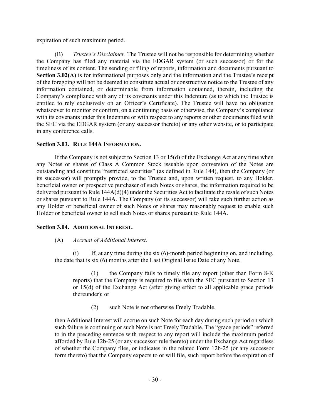 - 30 - expiration of such maximum period. (B) Trustee’s Disclaimer. The Trustee will not be responsible for determining whether the Company has filed any material via the EDGAR system (or such successor) or for the timeliness of its content. The sending or filing of reports, information and documents pursuant to Section 3.02(A) is for informational purposes only and the information and the Trustee’s receipt of the foregoing will not be deemed to constitute actual or constructive notice to the Trustee of any information contained, or determinable from information contained, therein, including the Company’s compliance with any of its covenants under this Indenture (as to which the Trustee is entitled to rely exclusively on an Officer’s Certificate). The Trustee will have no obligation whatsoever to monitor or confirm, on a continuing basis or otherwise, the Company’s compliance with its covenants under this Indenture or with respect to any reports or other documents filed with the SEC via the EDGAR system (or any successor thereto) or any other website, or to participate in any conference calls. Section 3.03. RULE 144A INFORMATION. If the Company is not subject to Section 13 or 15(d) of the Exchange Act at any time when any Notes or shares of Class A Common Stock issuable upon conversion of the Notes are outstanding and constitute “restricted securities” (as defined in Rule 144), then the Company (or its successor) will promptly provide, to the Trustee and, upon written request, to any Holder, beneficial owner or prospective purchaser of such Notes or shares, the information required to be delivered pursuant to Rule 144A(d)(4) under the Securities Act to facilitate the resale of such Notes or shares pursuant to Rule 144A. The Company (or its successor) will take such further action as any Holder or beneficial owner of such Notes or shares may reasonably request to enable such Holder or beneficial owner to sell such Notes or shares pursuant to Rule 144A. Section 3.04. ADDITIONAL INTEREST. (A) Accrual of Additional Interest. (i) If, at any time during the six (6)-month period beginning on, and including, the date that is six (6) months after the Last Original Issue Date of any Note, (1) the Company fails to timely file any report (other than Form 8-K reports) that the Company is required to file with the SEC pursuant to Section 13 or 15(d) of the Exchange Act (after giving effect to all applicable grace periods thereunder); or (2) such Note is not otherwise Freely Tradable, then Additional Interest will accrue on such Note for each day during such period on which such failure is continuing or such Note is not Freely Tradable. The “grace periods” referred to in the preceding sentence with respect to any report will include the maximum period afforded by Rule 12b-25 (or any successor rule thereto) under the Exchange Act regardless of whether the Company files, or indicates in the related Form 12b-25 (or any successor form thereto) that the Company expects to or will file, such report before the expiration of