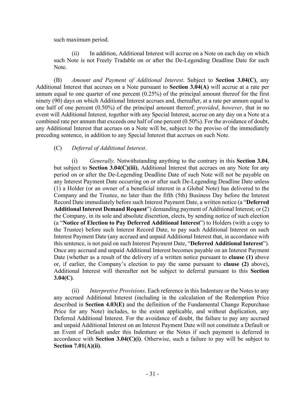 - 31 - such maximum period. (ii) In addition, Additional Interest will accrue on a Note on each day on which such Note is not Freely Tradable on or after the De-Legending Deadline Date for such Note. (B) Amount and Payment of Additional Interest. Subject to Section 3.04(C), any Additional Interest that accrues on a Note pursuant to Section 3.04(A) will accrue at a rate per annum equal to one quarter of one percent (0.25%) of the principal amount thereof for the first ninety (90) days on which Additional Interest accrues and, thereafter, at a rate per annum equal to one half of one percent (0.50%) of the principal amount thereof; provided, however, that in no event will Additional Interest, together with any Special Interest, accrue on any day on a Note at a combined rate per annum that exceeds one half of one percent (0.50%). For the avoidance of doubt, any Additional Interest that accrues on a Note will be, subject to the proviso of the immediately preceding sentence, in addition to any Special Interest that accrues on such Note. (C) Deferral of Additional Interest. (i) Generally. Notwithstanding anything to the contrary in this Section 3.04, but subject to Section 3.04(C)(iii), Additional Interest that accrues on any Note for any period on or after the De-Legending Deadline Date of such Note will not be payable on any Interest Payment Date occurring on or after such De-Legending Deadline Date unless (1) a Holder (or an owner of a beneficial interest in a Global Note) has delivered to the Company and the Trustee, no later than the fifth (5th) Business Day before the Interest Record Date immediately before such Interest Payment Date, a written notice (a “Deferred Additional Interest Demand Request”) demanding payment of Additional Interest; or (2) the Company, in its sole and absolute discretion, elects, by sending notice of such election (a “Notice of Election to Pay Deferred Additional Interest”) to Holders (with a copy to the Trustee) before such Interest Record Date, to pay such Additional Interest on such Interest Payment Date (any accrued and unpaid Additional Interest that, in accordance with this sentence, is not paid on such Interest Payment Date, “Deferred Additional Interest”). Once any accrued and unpaid Additional Interest becomes payable on an Interest Payment Date (whether as a result of the delivery of a written notice pursuant to clause (1) above or, if earlier, the Company’s election to pay the same pursuant to clause (2) above), Additional Interest will thereafter not be subject to deferral pursuant to this Section 3.04(C). (ii) Interpretive Provisions. Each reference in this Indenture or the Notes to any any accrued Additional Interest (including in the calculation of the Redemption Price described in Section 4.03(E) and the definition of the Fundamental Change Repurchase Price for any Note) includes, to the extent applicable, and without duplication, any Deferred Additional Interest. For the avoidance of doubt, the failure to pay any accrued and unpaid Additional Interest on an Interest Payment Date will not constitute a Default or an Event of Default under this Indenture or the Notes if such payment is deferred in accordance with Section 3.04(C)(i). Otherwise, such a failure to pay will be subject to Section 7.01(A)(ii).