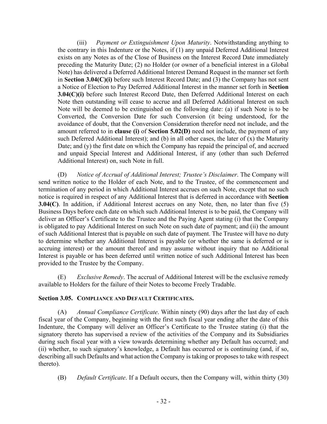 - 32 - (iii) Payment or Extinguishment Upon Maturity. Notwithstanding anything to the contrary in this Indenture or the Notes, if (1) any unpaid Deferred Additional Interest exists on any Notes as of the Close of Business on the Interest Record Date immediately preceding the Maturity Date; (2) no Holder (or owner of a beneficial interest in a Global Note) has delivered a Deferred Additional Interest Demand Request in the manner set forth in Section 3.04(C)(i) before such Interest Record Date; and (3) the Company has not sent a Notice of Election to Pay Deferred Additional Interest in the manner set forth in Section 3.04(C)(i) before such Interest Record Date, then Deferred Additional Interest on each Note then outstanding will cease to accrue and all Deferred Additional Interest on such Note will be deemed to be extinguished on the following date: (a) if such Note is to be Converted, the Conversion Date for such Conversion (it being understood, for the avoidance of doubt, that the Conversion Consideration therefor need not include, and the amount referred to in clause (i) of Section 5.02(D) need not include, the payment of any such Deferred Additional Interest); and (b) in all other cases, the later of (x) the Maturity Date; and (y) the first date on which the Company has repaid the principal of, and accrued and unpaid Special Interest and Additional Interest, if any (other than such Deferred Additional Interest) on, such Note in full. (D) Notice of Accrual of Additional Interest; Trustee’s Disclaimer. The Company will send written notice to the Holder of each Note, and to the Trustee, of the commencement and termination of any period in which Additional Interest accrues on such Note, except that no such notice is required in respect of any Additional Interest that is deferred in accordance with Section 3.04(C). In addition, if Additional Interest accrues on any Note, then, no later than five (5) Business Days before each date on which such Additional Interest is to be paid, the Company will deliver an Officer’s Certificate to the Trustee and the Paying Agent stating (i) that the Company is obligated to pay Additional Interest on such Note on such date of payment; and (ii) the amount of such Additional Interest that is payable on such date of payment. The Trustee will have no duty to determine whether any Additional Interest is payable (or whether the same is deferred or is accruing interest) or the amount thereof and may assume without inquiry that no Additional Interest is payable or has been deferred until written notice of such Additional Interest has been provided to the Trustee by the Company. (E) Exclusive Remedy. The accrual of Additional Interest will be the exclusive remedy available to Holders for the failure of their Notes to become Freely Tradable. Section 3.05. COMPLIANCE AND DEFAULT CERTIFICATES. (A) Annual Compliance Certificate. Within ninety (90) days after the last day of each fiscal year of the Company, beginning with the first such fiscal year ending after the date of this Indenture, the Company will deliver an Officer’s Certificate to the Trustee stating (i) that the signatory thereto has supervised a review of the activities of the Company and its Subsidiaries during such fiscal year with a view towards determining whether any Default has occurred; and (ii) whether, to such signatory’s knowledge, a Default has occurred or is continuing (and, if so, describing all such Defaults and what action the Company is taking or proposes to take with respect thereto). (B) Default Certificate. If a Default occurs, then the Company will, within thirty (30)
