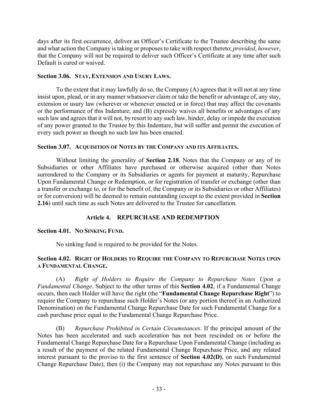 - 33 - days after its first occurrence, deliver an Officer’s Certificate to the Trustee describing the same and what action the Company is taking or proposes to take with respect thereto; provided, however, that the Company will not be required to deliver such Officer’s Certificate at any time after such Default is cured or waived. Section 3.06. STAY, EXTENSION AND USURY LAWS. To the extent that it may lawfully do so, the Company (A) agrees that it will not at any time insist upon, plead, or in any manner whatsoever claim or take the benefit or advantage of, any stay, extension or usury law (wherever or whenever enacted or in force) that may affect the covenants or the performance of this Indenture; and (B) expressly waives all benefits or advantages of any such law and agrees that it will not, by resort to any such law, hinder, delay or impede the execution of any power granted to the Trustee by this Indenture, but will suffer and permit the execution of every such power as though no such law has been enacted. Section 3.07. ACQUISITION OF NOTES BY THE COMPANY AND ITS AFFILIATES. Without limiting the generality of Section 2.18, Notes that the Company or any of its Subsidiaries or other Affiliates have purchased or otherwise acquired (other than Notes surrendered to the Company or its Subsidiaries or agents for payment at maturity, Repurchase Upon Fundamental Change or Redemption, or for registration of transfer or exchange (other than a transfer or exchange to, or for the benefit of, the Company or its Subsidiaries or other Affiliates) or for conversion) will be deemed to remain outstanding (except to the extent provided in Section 2.16) until such time as such Notes are delivered to the Trustee for cancellation. Article 4. REPURCHASE AND REDEMPTION Section 4.01. NO SINKING FUND. No sinking fund is required to be provided for the Notes. Section 4.02. RIGHT OF HOLDERS TO REQUIRE THE COMPANY TO REPURCHASE NOTES UPON A FUNDAMENTAL CHANGE. (A) Right of Holders to Require the Company to Repurchase Notes Upon a Fundamental Change. Subject to the other terms of this Section 4.02, if a Fundamental Change occurs, then each Holder will have the right (the “Fundamental Change Repurchase Right”) to require the Company to repurchase such Holder’s Notes (or any portion thereof in an Authorized Denomination) on the Fundamental Change Repurchase Date for such Fundamental Change for a cash purchase price equal to the Fundamental Change Repurchase Price. (B) Repurchase Prohibited in Certain Circumstances. If the principal amount of the Notes has been accelerated and such acceleration has not been rescinded on or before the Fundamental Change Repurchase Date for a Repurchase Upon Fundamental Change (including as a result of the payment of the related Fundamental Change Repurchase Price, and any related interest pursuant to the proviso to the first sentence of Section 4.02(D), on such Fundamental Change Repurchase Date), then (i) the Company may not repurchase any Notes pursuant to this