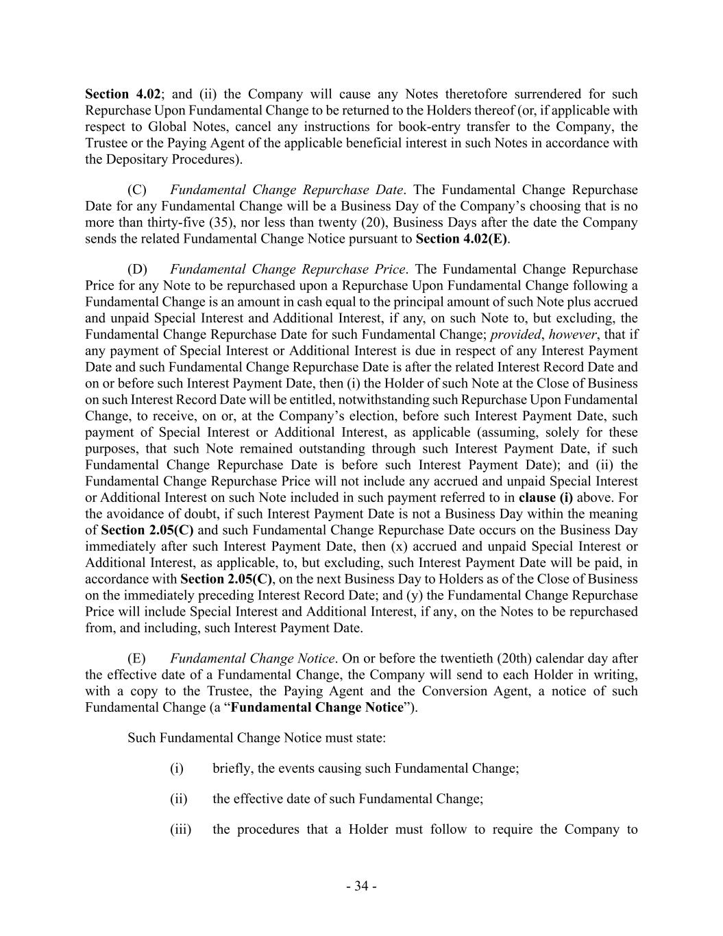 - 34 - Section 4.02; and (ii) the Company will cause any Notes theretofore surrendered for such Repurchase Upon Fundamental Change to be returned to the Holders thereof (or, if applicable with respect to Global Notes, cancel any instructions for book-entry transfer to the Company, the Trustee or the Paying Agent of the applicable beneficial interest in such Notes in accordance with the Depositary Procedures). (C) Fundamental Change Repurchase Date. The Fundamental Change Repurchase Date for any Fundamental Change will be a Business Day of the Company’s choosing that is no more than thirty-five (35), nor less than twenty (20), Business Days after the date the Company sends the related Fundamental Change Notice pursuant to Section 4.02(E). (D) Fundamental Change Repurchase Price. The Fundamental Change Repurchase Price for any Note to be repurchased upon a Repurchase Upon Fundamental Change following a Fundamental Change is an amount in cash equal to the principal amount of such Note plus accrued and unpaid Special Interest and Additional Interest, if any, on such Note to, but excluding, the Fundamental Change Repurchase Date for such Fundamental Change; provided, however, that if any payment of Special Interest or Additional Interest is due in respect of any Interest Payment Date and such Fundamental Change Repurchase Date is after the related Interest Record Date and on or before such Interest Payment Date, then (i) the Holder of such Note at the Close of Business on such Interest Record Date will be entitled, notwithstanding such Repurchase Upon Fundamental Change, to receive, on or, at the Company’s election, before such Interest Payment Date, such payment of Special Interest or Additional Interest, as applicable (assuming, solely for these purposes, that such Note remained outstanding through such Interest Payment Date, if such Fundamental Change Repurchase Date is before such Interest Payment Date); and (ii) the Fundamental Change Repurchase Price will not include any accrued and unpaid Special Interest or Additional Interest on such Note included in such payment referred to in clause (i) above. For the avoidance of doubt, if such Interest Payment Date is not a Business Day within the meaning of Section 2.05(C) and such Fundamental Change Repurchase Date occurs on the Business Day immediately after such Interest Payment Date, then (x) accrued and unpaid Special Interest or Additional Interest, as applicable, to, but excluding, such Interest Payment Date will be paid, in accordance with Section 2.05(C), on the next Business Day to Holders as of the Close of Business on the immediately preceding Interest Record Date; and (y) the Fundamental Change Repurchase Price will include Special Interest and Additional Interest, if any, on the Notes to be repurchased from, and including, such Interest Payment Date. (E) Fundamental Change Notice. On or before the twentieth (20th) calendar day after the effective date of a Fundamental Change, the Company will send to each Holder in writing, with a copy to the Trustee, the Paying Agent and the Conversion Agent, a notice of such Fundamental Change (a “Fundamental Change Notice”). Such Fundamental Change Notice must state: (i) briefly, the events causing such Fundamental Change; (ii) the effective date of such Fundamental Change; (iii) the procedures that a Holder must follow to require the Company to