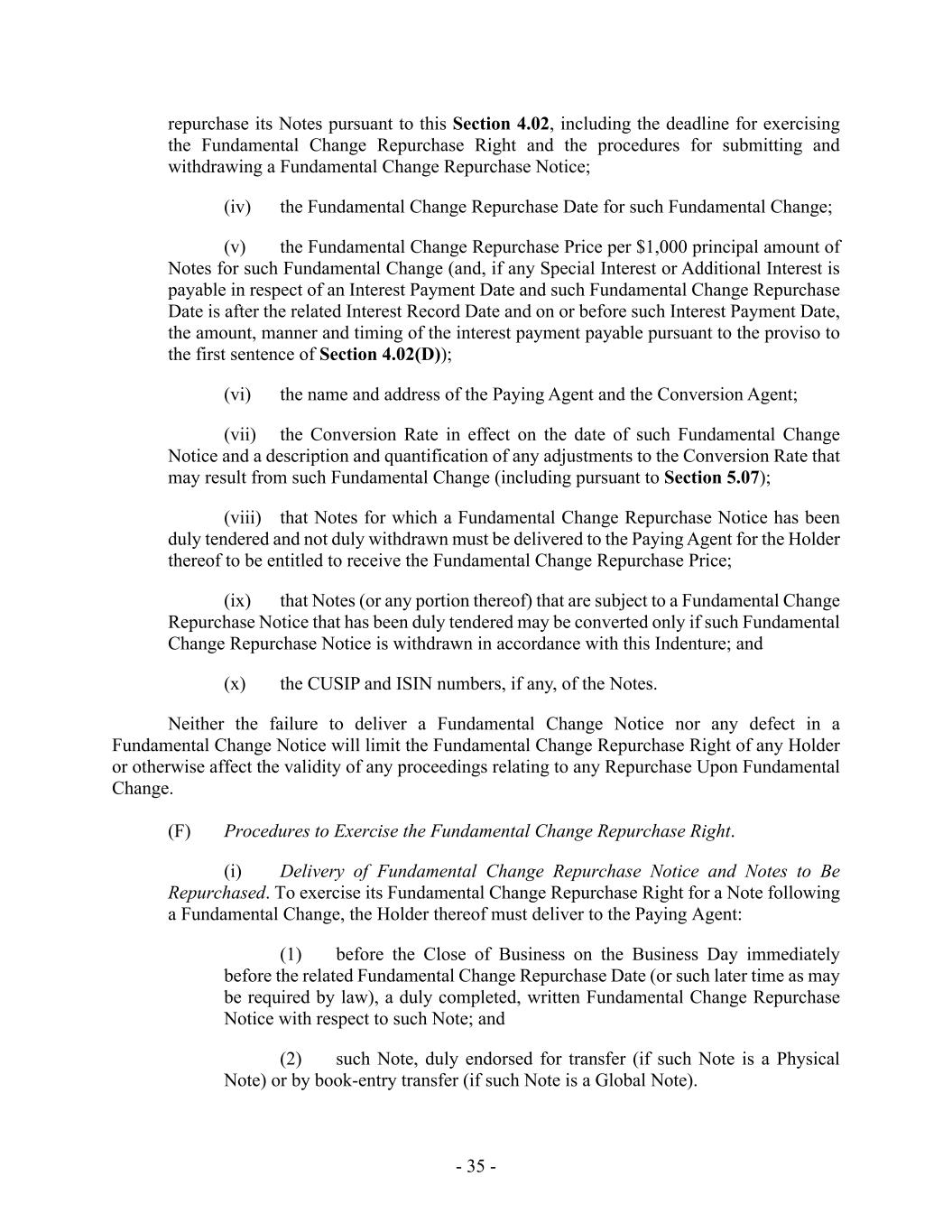 - 35 - repurchase its Notes pursuant to this Section 4.02, including the deadline for exercising the Fundamental Change Repurchase Right and the procedures for submitting and withdrawing a Fundamental Change Repurchase Notice; (iv) the Fundamental Change Repurchase Date for such Fundamental Change; (v) the Fundamental Change Repurchase Price per $1,000 principal amount of Notes for such Fundamental Change (and, if any Special Interest or Additional Interest is payable in respect of an Interest Payment Date and such Fundamental Change Repurchase Date is after the related Interest Record Date and on or before such Interest Payment Date, the amount, manner and timing of the interest payment payable pursuant to the proviso to the first sentence of Section 4.02(D)); (vi) the name and address of the Paying Agent and the Conversion Agent; (vii) the Conversion Rate in effect on the date of such Fundamental Change Notice and a description and quantification of any adjustments to the Conversion Rate that may result from such Fundamental Change (including pursuant to Section 5.07); (viii) that Notes for which a Fundamental Change Repurchase Notice has been duly tendered and not duly withdrawn must be delivered to the Paying Agent for the Holder thereof to be entitled to receive the Fundamental Change Repurchase Price; (ix) that Notes (or any portion thereof) that are subject to a Fundamental Change Repurchase Notice that has been duly tendered may be converted only if such Fundamental Change Repurchase Notice is withdrawn in accordance with this Indenture; and (x) the CUSIP and ISIN numbers, if any, of the Notes. Neither the failure to deliver a Fundamental Change Notice nor any defect in a Fundamental Change Notice will limit the Fundamental Change Repurchase Right of any Holder or otherwise affect the validity of any proceedings relating to any Repurchase Upon Fundamental Change. (F) Procedures to Exercise the Fundamental Change Repurchase Right. (i) Delivery of Fundamental Change Repurchase Notice and Notes to Be Repurchased. To exercise its Fundamental Change Repurchase Right for a Note following a Fundamental Change, the Holder thereof must deliver to the Paying Agent: (1) before the Close of Business on the Business Day immediately before the related Fundamental Change Repurchase Date (or such later time as may be required by law), a duly completed, written Fundamental Change Repurchase Notice with respect to such Note; and (2) such Note, duly endorsed for transfer (if such Note is a Physical Note) or by book-entry transfer (if such Note is a Global Note).