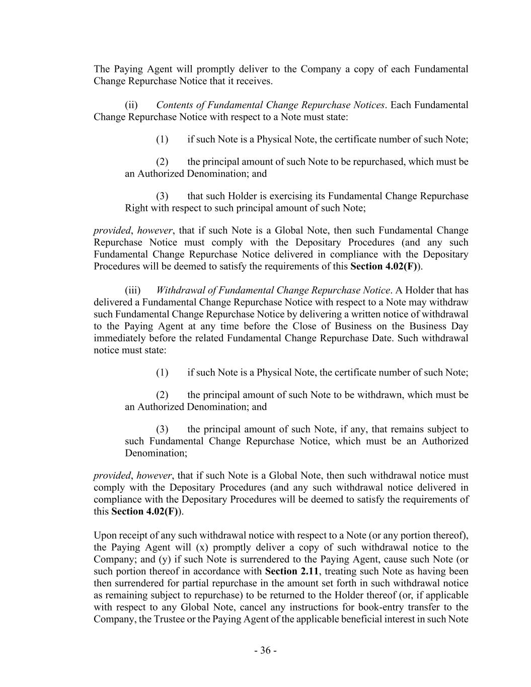 - 36 - The Paying Agent will promptly deliver to the Company a copy of each Fundamental Change Repurchase Notice that it receives. (ii) Contents of Fundamental Change Repurchase Notices. Each Fundamental Change Repurchase Notice with respect to a Note must state: (1) if such Note is a Physical Note, the certificate number of such Note; (2) the principal amount of such Note to be repurchased, which must be an Authorized Denomination; and (3) that such Holder is exercising its Fundamental Change Repurchase Right with respect to such principal amount of such Note; provided, however, that if such Note is a Global Note, then such Fundamental Change Repurchase Notice must comply with the Depositary Procedures (and any such Fundamental Change Repurchase Notice delivered in compliance with the Depositary Procedures will be deemed to satisfy the requirements of this Section 4.02(F)). (iii) Withdrawal of Fundamental Change Repurchase Notice. A Holder that has delivered a Fundamental Change Repurchase Notice with respect to a Note may withdraw such Fundamental Change Repurchase Notice by delivering a written notice of withdrawal to the Paying Agent at any time before the Close of Business on the Business Day immediately before the related Fundamental Change Repurchase Date. Such withdrawal notice must state: (1) if such Note is a Physical Note, the certificate number of such Note; (2) the principal amount of such Note to be withdrawn, which must be an Authorized Denomination; and (3) the principal amount of such Note, if any, that remains subject to such Fundamental Change Repurchase Notice, which must be an Authorized Denomination; provided, however, that if such Note is a Global Note, then such withdrawal notice must comply with the Depositary Procedures (and any such withdrawal notice delivered in compliance with the Depositary Procedures will be deemed to satisfy the requirements of this Section 4.02(F)). Upon receipt of any such withdrawal notice with respect to a Note (or any portion thereof), the Paying Agent will (x) promptly deliver a copy of such withdrawal notice to the Company; and (y) if such Note is surrendered to the Paying Agent, cause such Note (or such portion thereof in accordance with Section 2.11, treating such Note as having been then surrendered for partial repurchase in the amount set forth in such withdrawal notice as remaining subject to repurchase) to be returned to the Holder thereof (or, if applicable with respect to any Global Note, cancel any instructions for book-entry transfer to the Company, the Trustee or the Paying Agent of the applicable beneficial interest in such Note