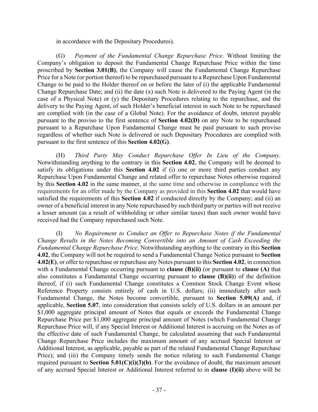 - 37 - in accordance with the Depositary Procedures). (G) Payment of the Fundamental Change Repurchase Price. Without limiting the Company’s obligation to deposit the Fundamental Change Repurchase Price within the time proscribed by Section 3.01(B), the Company will cause the Fundamental Change Repurchase Price for a Note (or portion thereof) to be repurchased pursuant to a Repurchase Upon Fundamental Change to be paid to the Holder thereof on or before the later of (i) the applicable Fundamental Change Repurchase Date; and (ii) the date (x) such Note is delivered to the Paying Agent (in the case of a Physical Note) or (y) the Depositary Procedures relating to the repurchase, and the delivery to the Paying Agent, of such Holder’s beneficial interest in such Note to be repurchased are complied with (in the case of a Global Note). For the avoidance of doubt, interest payable pursuant to the proviso to the first sentence of Section 4.02(D) on any Note to be repurchased pursuant to a Repurchase Upon Fundamental Change must be paid pursuant to such proviso regardless of whether such Note is delivered or such Depositary Procedures are complied with pursuant to the first sentence of this Section 4.02(G). (H) Third Party May Conduct Repurchase Offer In Lieu of the Company. Notwithstanding anything to the contrary in this Section 4.02, the Company will be deemed to satisfy its obligations under this Section 4.02 if (i) one or more third parties conduct any Repurchase Upon Fundamental Change and related offer to repurchase Notes otherwise required by this Section 4.02 in the same manner, at the same time and otherwise in compliance with the requirements for an offer made by the Company as provided in this Section 4.02 that would have satisfied the requirements of this Section 4.02 if conducted directly by the Company; and (ii) an owner of a beneficial interest in any Note repurchased by such third party or parties will not receive a lesser amount (as a result of withholding or other similar taxes) than such owner would have received had the Company repurchased such Note. (I) No Requirement to Conduct an Offer to Repurchase Notes if the Fundamental Change Results in the Notes Becoming Convertible into an Amount of Cash Exceeding the Fundamental Change Repurchase Price. Notwithstanding anything to the contrary in this Section 4.02, the Company will not be required to send a Fundamental Change Notice pursuant to Section 4.02(E), or offer to repurchase or repurchase any Notes pursuant to this Section 4.02, in connection with a Fundamental Change occurring pursuant to clause (B)(ii) (or pursuant to clause (A) that also constitutes a Fundamental Change occurring pursuant to clause (B)(ii)) of the definition thereof, if (i) such Fundamental Change constitutes a Common Stock Change Event whose Reference Property consists entirely of cash in U.S. dollars; (ii) immediately after such Fundamental Change, the Notes become convertible, pursuant to Section 5.09(A) and, if applicable, Section 5.07, into consideration that consists solely of U.S. dollars in an amount per $1,000 aggregate principal amount of Notes that equals or exceeds the Fundamental Change Repurchase Price per $1,000 aggregate principal amount of Notes (which Fundamental Change Repurchase Price will, if any Special Interest or Additional Interest is accruing on the Notes as of the effective date of such Fundamental Change, be calculated assuming that such Fundamental Change Repurchase Price includes the maximum amount of any accrued Special Interest or Additional Interest, as applicable, payable as part of the related Fundamental Change Repurchase Price); and (iii) the Company timely sends the notice relating to such Fundamental Change required pursuant to Section 5.01(C)(i)(3)(b). For the avoidance of doubt, the maximum amount of any accrued Special Interest or Additional Interest referred to in clause (I)(ii) above will be