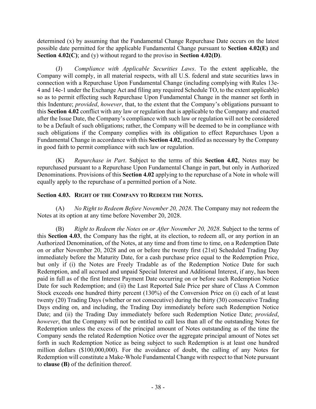 - 38 - determined (x) by assuming that the Fundamental Change Repurchase Date occurs on the latest possible date permitted for the applicable Fundamental Change pursuant to Section 4.02(E) and Section 4.02(C); and (y) without regard to the proviso in Section 4.02(D). (J) Compliance with Applicable Securities Laws. To the extent applicable, the Company will comply, in all material respects, with all U.S. federal and state securities laws in connection with a Repurchase Upon Fundamental Change (including complying with Rules 13e- 4 and 14e-1 under the Exchange Act and filing any required Schedule TO, to the extent applicable) so as to permit effecting such Repurchase Upon Fundamental Change in the manner set forth in this Indenture; provided, however, that, to the extent that the Company’s obligations pursuant to this Section 4.02 conflict with any law or regulation that is applicable to the Company and enacted after the Issue Date, the Company’s compliance with such law or regulation will not be considered to be a Default of such obligations; rather, the Company will be deemed to be in compliance with such obligations if the Company complies with its obligation to effect Repurchases Upon a Fundamental Change in accordance with this Section 4.02, modified as necessary by the Company in good faith to permit compliance with such law or regulation. (K) Repurchase in Part. Subject to the terms of this Section 4.02, Notes may be repurchased pursuant to a Repurchase Upon Fundamental Change in part, but only in Authorized Denominations. Provisions of this Section 4.02 applying to the repurchase of a Note in whole will equally apply to the repurchase of a permitted portion of a Note. Section 4.03. RIGHT OF THE COMPANY TO REDEEM THE NOTES. (A) No Right to Redeem Before November 20, 2028. The Company may not redeem the Notes at its option at any time before November 20, 2028. (B) Right to Redeem the Notes on or After November 20, 2028. Subject to the terms of this Section 4.03, the Company has the right, at its election, to redeem all, or any portion in an Authorized Denomination, of the Notes, at any time and from time to time, on a Redemption Date on or after November 20, 2028 and on or before the twenty first (21st) Scheduled Trading Day immediately before the Maturity Date, for a cash purchase price equal to the Redemption Price, but only if (i) the Notes are Freely Tradable as of the Redemption Notice Date for such Redemption, and all accrued and unpaid Special Interest and Additional Interest, if any, has been paid in full as of the first Interest Payment Date occurring on or before such Redemption Notice Date for such Redemption; and (ii) the Last Reported Sale Price per share of Class A Common Stock exceeds one hundred thirty percent (130%) of the Conversion Price on (i) each of at least twenty (20) Trading Days (whether or not consecutive) during the thirty (30) consecutive Trading Days ending on, and including, the Trading Day immediately before such Redemption Notice Date; and (ii) the Trading Day immediately before such Redemption Notice Date; provided, however, that the Company will not be entitled to call less than all of the outstanding Notes for Redemption unless the excess of the principal amount of Notes outstanding as of the time the Company sends the related Redemption Notice over the aggregate principal amount of Notes set forth in such Redemption Notice as being subject to such Redemption is at least one hundred million dollars ($100,000,000). For the avoidance of doubt, the calling of any Notes for Redemption will constitute a Make-Whole Fundamental Change with respect to that Note pursuant to clause (B) of the definition thereof.