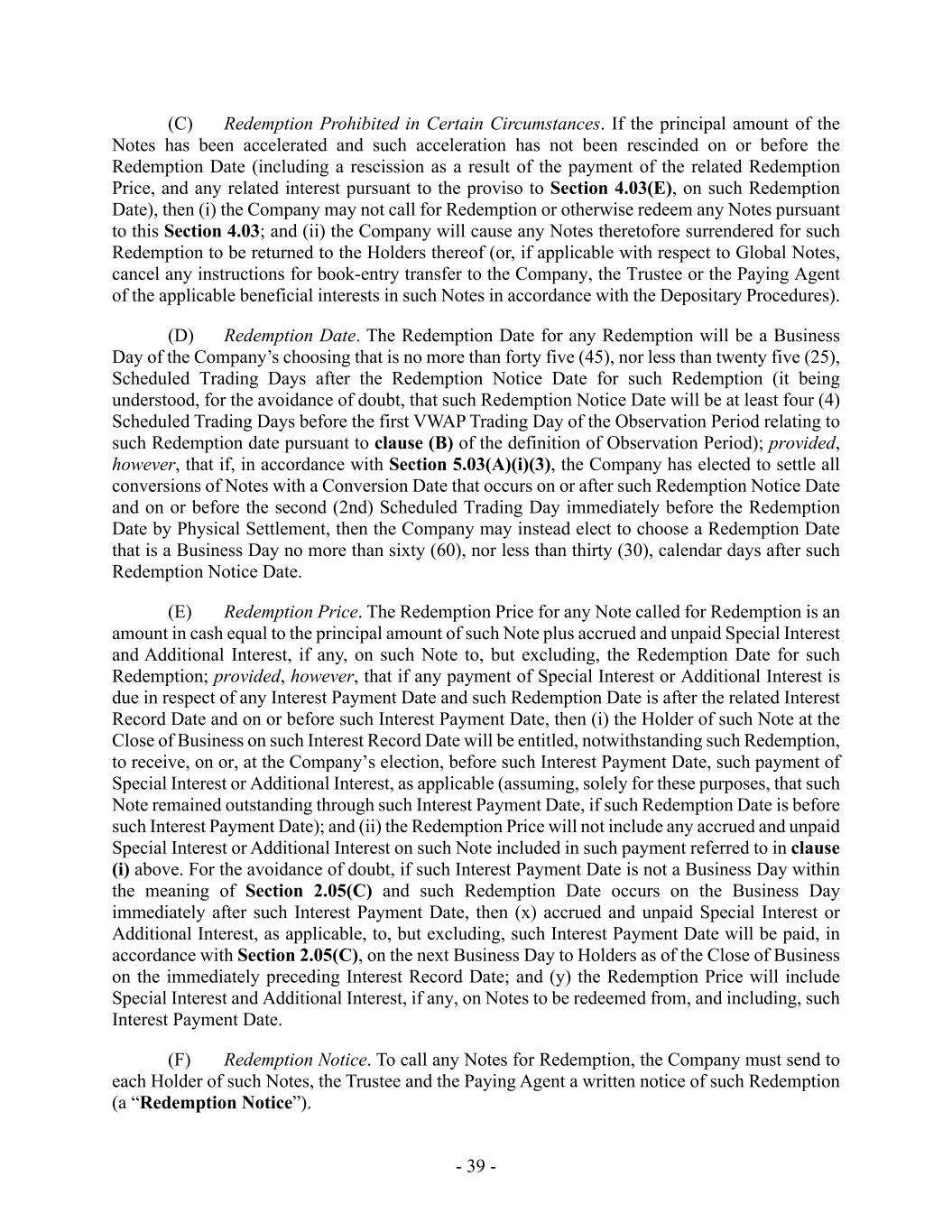- 39 - (C) Redemption Prohibited in Certain Circumstances. If the principal amount of the Notes has been accelerated and such acceleration has not been rescinded on or before the Redemption Date (including a rescission as a result of the payment of the related Redemption Price, and any related interest pursuant to the proviso to Section 4.03(E), on such Redemption Date), then (i) the Company may not call for Redemption or otherwise redeem any Notes pursuant to this Section 4.03; and (ii) the Company will cause any Notes theretofore surrendered for such Redemption to be returned to the Holders thereof (or, if applicable with respect to Global Notes, cancel any instructions for book-entry transfer to the Company, the Trustee or the Paying Agent of the applicable beneficial interests in such Notes in accordance with the Depositary Procedures). (D) Redemption Date. The Redemption Date for any Redemption will be a Business Day of the Company’s choosing that is no more than forty five (45), nor less than twenty five (25), Scheduled Trading Days after the Redemption Notice Date for such Redemption (it being understood, for the avoidance of doubt, that such Redemption Notice Date will be at least four (4) Scheduled Trading Days before the first VWAP Trading Day of the Observation Period relating to such Redemption date pursuant to clause (B) of the definition of Observation Period); provided, however, that if, in accordance with Section 5.03(A)(i)(3), the Company has elected to settle all conversions of Notes with a Conversion Date that occurs on or after such Redemption Notice Date and on or before the second (2nd) Scheduled Trading Day immediately before the Redemption Date by Physical Settlement, then the Company may instead elect to choose a Redemption Date that is a Business Day no more than sixty (60), nor less than thirty (30), calendar days after such Redemption Notice Date. (E) Redemption Price. The Redemption Price for any Note called for Redemption is an amount in cash equal to the principal amount of such Note plus accrued and unpaid Special Interest and Additional Interest, if any, on such Note to, but excluding, the Redemption Date for such Redemption; provided, however, that if any payment of Special Interest or Additional Interest is due in respect of any Interest Payment Date and such Redemption Date is after the related Interest Record Date and on or before such Interest Payment Date, then (i) the Holder of such Note at the Close of Business on such Interest Record Date will be entitled, notwithstanding such Redemption, to receive, on or, at the Company’s election, before such Interest Payment Date, such payment of Special Interest or Additional Interest, as applicable (assuming, solely for these purposes, that such Note remained outstanding through such Interest Payment Date, if such Redemption Date is before such Interest Payment Date); and (ii) the Redemption Price will not include any accrued and unpaid Special Interest or Additional Interest on such Note included in such payment referred to in clause (i) above. For the avoidance of doubt, if such Interest Payment Date is not a Business Day within the meaning of Section 2.05(C) and such Redemption Date occurs on the Business Day immediately after such Interest Payment Date, then (x) accrued and unpaid Special Interest or Additional Interest, as applicable, to, but excluding, such Interest Payment Date will be paid, in accordance with Section 2.05(C), on the next Business Day to Holders as of the Close of Business on the immediately preceding Interest Record Date; and (y) the Redemption Price will include Special Interest and Additional Interest, if any, on Notes to be redeemed from, and including, such Interest Payment Date. (F) Redemption Notice. To call any Notes for Redemption, the Company must send to each Holder of such Notes, the Trustee and the Paying Agent a written notice of such Redemption (a “Redemption Notice”).