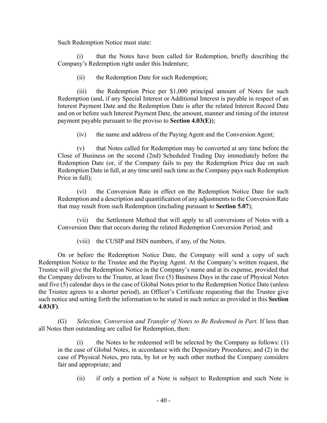 - 40 - Such Redemption Notice must state: (i) that the Notes have been called for Redemption, briefly describing the Company’s Redemption right under this Indenture; (ii) the Redemption Date for such Redemption; (iii) the Redemption Price per $1,000 principal amount of Notes for such Redemption (and, if any Special Interest or Additional Interest is payable in respect of an Interest Payment Date and the Redemption Date is after the related Interest Record Date and on or before such Interest Payment Date, the amount, manner and timing of the interest payment payable pursuant to the proviso to Section 4.03(E)); (iv) the name and address of the Paying Agent and the Conversion Agent; (v) that Notes called for Redemption may be converted at any time before the Close of Business on the second (2nd) Scheduled Trading Day immediately before the Redemption Date (or, if the Company fails to pay the Redemption Price due on such Redemption Date in full, at any time until such time as the Company pays such Redemption Price in full); (vi) the Conversion Rate in effect on the Redemption Notice Date for such Redemption and a description and quantification of any adjustments to the Conversion Rate that may result from such Redemption (including pursuant to Section 5.07); (vii) the Settlement Method that will apply to all conversions of Notes with a Conversion Date that occurs during the related Redemption Conversion Period; and (viii) the CUSIP and ISIN numbers, if any, of the Notes. On or before the Redemption Notice Date, the Company will send a copy of such Redemption Notice to the Trustee and the Paying Agent. At the Company’s written request, the Trustee will give the Redemption Notice in the Company’s name and at its expense, provided that the Company delivers to the Trustee, at least five (5) Business Days in the case of Physical Notes and five (5) calendar days in the case of Global Notes prior to the Redemption Notice Date (unless the Trustee agrees to a shorter period), an Officer’s Certificate requesting that the Trustee give such notice and setting forth the information to be stated in such notice as provided in this Section 4.03(F). (G) Selection, Conversion and Transfer of Notes to Be Redeemed in Part. If less than all Notes then outstanding are called for Redemption, then: (i) the Notes to be redeemed will be selected by the Company as follows: (1) in the case of Global Notes, in accordance with the Depositary Procedures; and (2) in the case of Physical Notes, pro rata, by lot or by such other method the Company considers fair and appropriate; and (ii) if only a portion of a Note is subject to Redemption and such Note is
