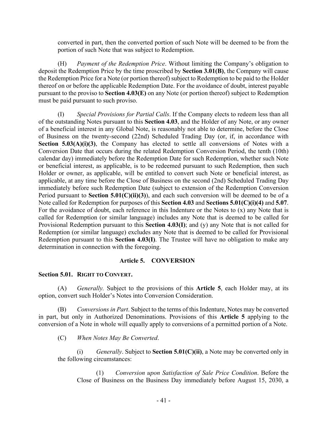 - 41 - converted in part, then the converted portion of such Note will be deemed to be from the portion of such Note that was subject to Redemption. (H) Payment of the Redemption Price. Without limiting the Company’s obligation to deposit the Redemption Price by the time proscribed by Section 3.01(B), the Company will cause the Redemption Price for a Note (or portion thereof) subject to Redemption to be paid to the Holder thereof on or before the applicable Redemption Date. For the avoidance of doubt, interest payable pursuant to the proviso to Section 4.03(E) on any Note (or portion thereof) subject to Redemption must be paid pursuant to such proviso. (I) Special Provisions for Partial Calls. If the Company elects to redeem less than all of the outstanding Notes pursuant to this Section 4.03, and the Holder of any Note, or any owner of a beneficial interest in any Global Note, is reasonably not able to determine, before the Close of Business on the twenty-second (22nd) Scheduled Trading Day (or, if, in accordance with Section 5.03(A)(i)(3), the Company has elected to settle all conversions of Notes with a Conversion Date that occurs during the related Redemption Conversion Period, the tenth (10th) calendar day) immediately before the Redemption Date for such Redemption, whether such Note or beneficial interest, as applicable, is to be redeemed pursuant to such Redemption, then such Holder or owner, as applicable, will be entitled to convert such Note or beneficial interest, as applicable, at any time before the Close of Business on the second (2nd) Scheduled Trading Day immediately before such Redemption Date (subject to extension of the Redemption Conversion Period pursuant to Section 5.01(C)(ii)(3)), and each such conversion will be deemed to be of a Note called for Redemption for purposes of this Section 4.03 and Sections 5.01(C)(i)(4) and 5.07. For the avoidance of doubt, each reference in this Indenture or the Notes to (x) any Note that is called for Redemption (or similar language) includes any Note that is deemed to be called for Provisional Redemption pursuant to this Section 4.03(I); and (y) any Note that is not called for Redemption (or similar language) excludes any Note that is deemed to be called for Provisional Redemption pursuant to this Section 4.03(I). The Trustee will have no obligation to make any determination in connection with the foregoing. Article 5. CONVERSION Section 5.01. RIGHT TO CONVERT. (A) Generally. Subject to the provisions of this Article 5, each Holder may, at its option, convert such Holder’s Notes into Conversion Consideration. (B) Conversions in Part. Subject to the terms of this Indenture, Notes may be converted in part, but only in Authorized Denominations. Provisions of this Article 5 applying to the conversion of a Note in whole will equally apply to conversions of a permitted portion of a Note. (C) When Notes May Be Converted. (i) Generally. Subject to Section 5.01(C)(ii), a Note may be converted only in the following circumstances: (1) Conversion upon Satisfaction of Sale Price Condition. Before the Close of Business on the Business Day immediately before August 15, 2030, a