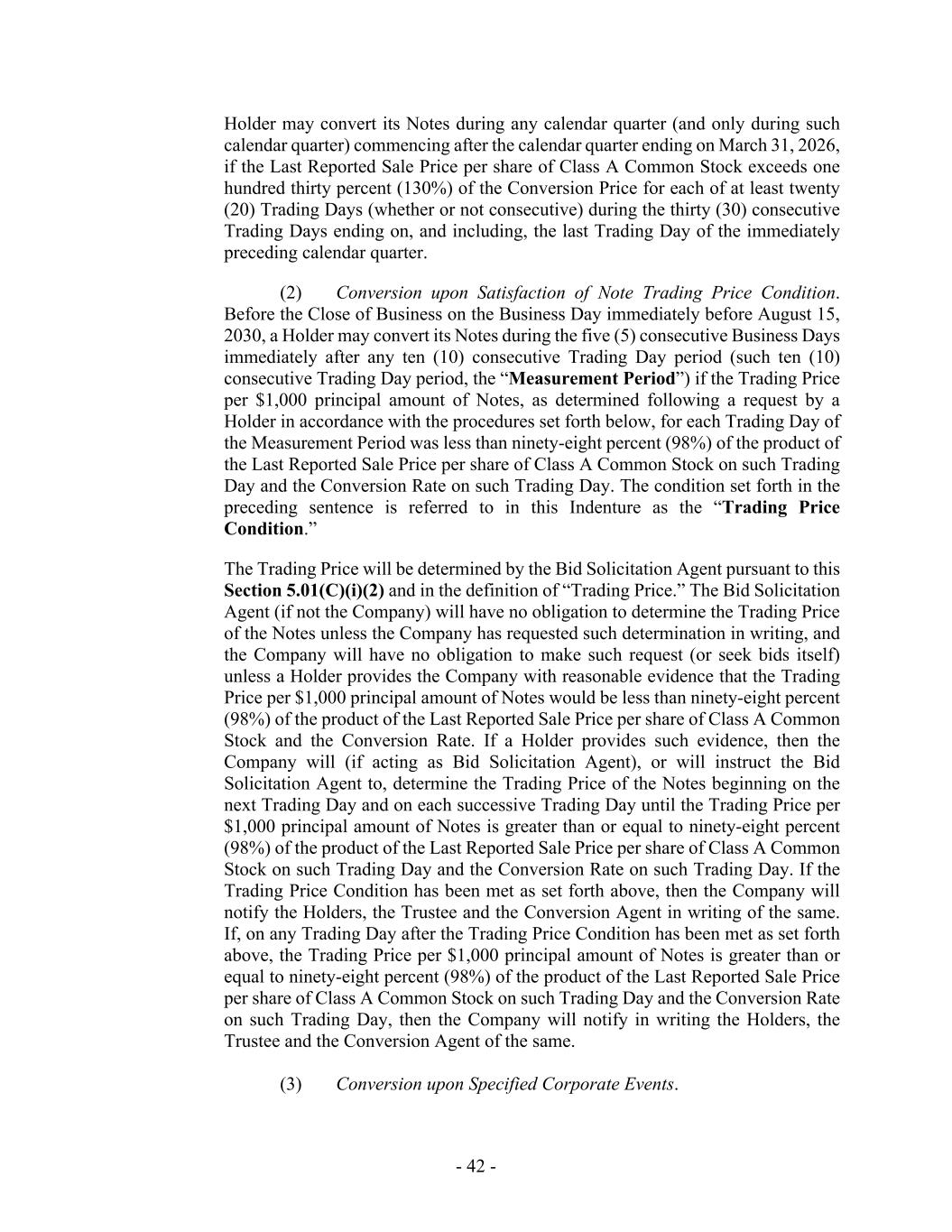 - 42 - Holder may convert its Notes during any calendar quarter (and only during such calendar quarter) commencing after the calendar quarter ending on March 31, 2026, if the Last Reported Sale Price per share of Class A Common Stock exceeds one hundred thirty percent (130%) of the Conversion Price for each of at least twenty (20) Trading Days (whether or not consecutive) during the thirty (30) consecutive Trading Days ending on, and including, the last Trading Day of the immediately preceding calendar quarter. (2) Conversion upon Satisfaction of Note Trading Price Condition. Before the Close of Business on the Business Day immediately before August 15, 2030, a Holder may convert its Notes during the five (5) consecutive Business Days immediately after any ten (10) consecutive Trading Day period (such ten (10) consecutive Trading Day period, the “Measurement Period”) if the Trading Price per $1,000 principal amount of Notes, as determined following a request by a Holder in accordance with the procedures set forth below, for each Trading Day of the Measurement Period was less than ninety-eight percent (98%) of the product of the Last Reported Sale Price per share of Class A Common Stock on such Trading Day and the Conversion Rate on such Trading Day. The condition set forth in the preceding sentence is referred to in this Indenture as the “Trading Price Condition.” The Trading Price will be determined by the Bid Solicitation Agent pursuant to this Section 5.01(C)(i)(2) and in the definition of “Trading Price.” The Bid Solicitation Agent (if not the Company) will have no obligation to determine the Trading Price of the Notes unless the Company has requested such determination in writing, and the Company will have no obligation to make such request (or seek bids itself) unless a Holder provides the Company with reasonable evidence that the Trading Price per $1,000 principal amount of Notes would be less than ninety-eight percent (98%) of the product of the Last Reported Sale Price per share of Class A Common Stock and the Conversion Rate. If a Holder provides such evidence, then the Company will (if acting as Bid Solicitation Agent), or will instruct the Bid Solicitation Agent to, determine the Trading Price of the Notes beginning on the next Trading Day and on each successive Trading Day until the Trading Price per $1,000 principal amount of Notes is greater than or equal to ninety-eight percent (98%) of the product of the Last Reported Sale Price per share of Class A Common Stock on such Trading Day and the Conversion Rate on such Trading Day. If the Trading Price Condition has been met as set forth above, then the Company will notify the Holders, the Trustee and the Conversion Agent in writing of the same. If, on any Trading Day after the Trading Price Condition has been met as set forth above, the Trading Price per $1,000 principal amount of Notes is greater than or equal to ninety-eight percent (98%) of the product of the Last Reported Sale Price per share of Class A Common Stock on such Trading Day and the Conversion Rate on such Trading Day, then the Company will notify in writing the Holders, the Trustee and the Conversion Agent of the same. (3) Conversion upon Specified Corporate Events.