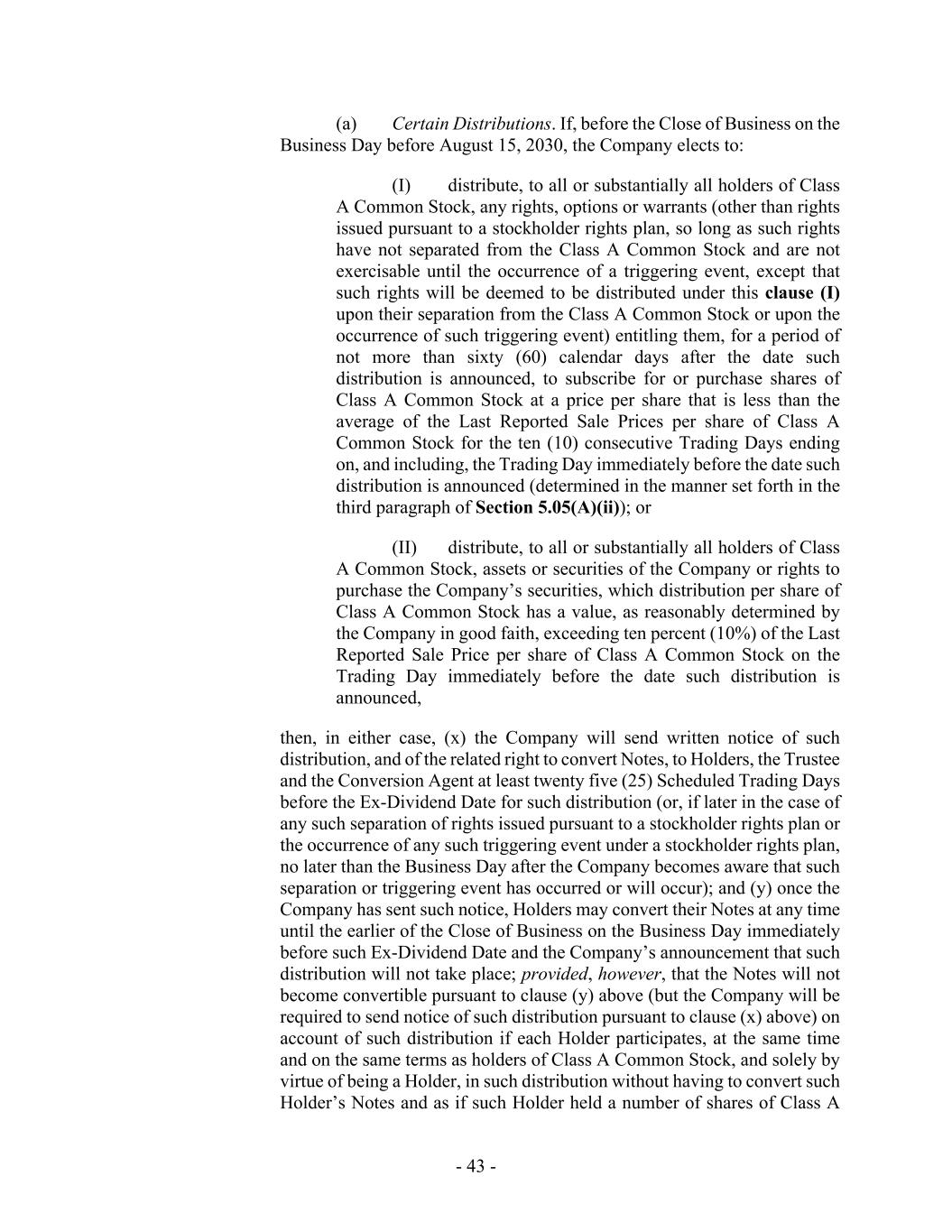 - 43 - (a) Certain Distributions. If, before the Close of Business on the Business Day before August 15, 2030, the Company elects to: (I) distribute, to all or substantially all holders of Class A Common Stock, any rights, options or warrants (other than rights issued pursuant to a stockholder rights plan, so long as such rights have not separated from the Class A Common Stock and are not exercisable until the occurrence of a triggering event, except that such rights will be deemed to be distributed under this clause (I) upon their separation from the Class A Common Stock or upon the occurrence of such triggering event) entitling them, for a period of not more than sixty (60) calendar days after the date such distribution is announced, to subscribe for or purchase shares of Class A Common Stock at a price per share that is less than the average of the Last Reported Sale Prices per share of Class A Common Stock for the ten (10) consecutive Trading Days ending on, and including, the Trading Day immediately before the date such distribution is announced (determined in the manner set forth in the third paragraph of Section 5.05(A)(ii)); or (II) distribute, to all or substantially all holders of Class A Common Stock, assets or securities of the Company or rights to purchase the Company’s securities, which distribution per share of Class A Common Stock has a value, as reasonably determined by the Company in good faith, exceeding ten percent (10%) of the Last Reported Sale Price per share of Class A Common Stock on the Trading Day immediately before the date such distribution is announced, then, in either case, (x) the Company will send written notice of such distribution, and of the related right to convert Notes, to Holders, the Trustee and the Conversion Agent at least twenty five (25) Scheduled Trading Days before the Ex-Dividend Date for such distribution (or, if later in the case of any such separation of rights issued pursuant to a stockholder rights plan or the occurrence of any such triggering event under a stockholder rights plan, no later than the Business Day after the Company becomes aware that such separation or triggering event has occurred or will occur); and (y) once the Company has sent such notice, Holders may convert their Notes at any time until the earlier of the Close of Business on the Business Day immediately before such Ex-Dividend Date and the Company’s announcement that such distribution will not take place; provided, however, that the Notes will not become convertible pursuant to clause (y) above (but the Company will be required to send notice of such distribution pursuant to clause (x) above) on account of such distribution if each Holder participates, at the same time and on the same terms as holders of Class A Common Stock, and solely by virtue of being a Holder, in such distribution without having to convert such Holder’s Notes and as if such Holder held a number of shares of Class A