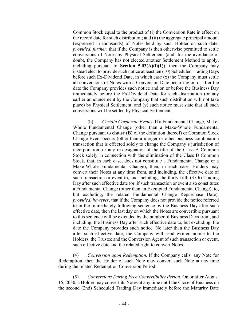 - 44 - Common Stock equal to the product of (i) the Conversion Rate in effect on the record date for such distribution; and (ii) the aggregate principal amount (expressed in thousands) of Notes held by such Holder on such date; provided, further, that if the Company is then otherwise permitted to settle conversions of Notes by Physical Settlement (and, for the avoidance of doubt, the Company has not elected another Settlement Method to apply, including pursuant to Section 5.03(A)(i)(1)), then the Company may instead elect to provide such notice at least ten (10) Scheduled Trading Days before such Ex-Dividend Date, in which case (x) the Company must settle all conversions of Notes with a Conversion Date occurring on or after the date the Company provides such notice and on or before the Business Day immediately before the Ex-Dividend Date for such distribution (or any earlier announcement by the Company that such distribution will not take place) by Physical Settlement; and (y) such notice must state that all such conversions will be settled by Physical Settlement. (b) Certain Corporate Events. If a Fundamental Change, Make- Whole Fundamental Change (other than a Make-Whole Fundamental Change pursuant to clause (B) of the definition thereof) or Common Stock Change Event occurs (other than a merger or other business combination transaction that is effected solely to change the Company’s jurisdiction of incorporation, or any re-designation of the title of the Class A Common Stock solely in connection with the elimination of the Class B Common Stock, that, in each case, does not constitute a Fundamental Change or a Make-Whole Fundamental Change), then, in each case, Holders may convert their Notes at any time from, and including, the effective date of such transaction or event to, and including, the thirty-fifth (35th) Trading Day after such effective date (or, if such transaction or event also constitutes a Fundamental Change (other than an Exempted Fundamental Change), to, but excluding, the related Fundamental Change Repurchase Date); provided, however, that if the Company does not provide the notice referred to in the immediately following sentence by the Business Day after such effective date, then the last day on which the Notes are convertible pursuant to this sentence will be extended by the number of Business Days from, and including, the Business Day after such effective date to, but excluding, the date the Company provides such notice. No later than the Business Day after such effective date, the Company will send written notice to the Holders, the Trustee and the Conversion Agent of such transaction or event, such effective date and the related right to convert Notes. (4) Conversion upon Redemption. If the Company calls any Note for Redemption, then the Holder of such Note may convert such Note at any time during the related Redemption Conversion Period. (5) Conversions During Free Convertibility Period. On or after August 15, 2030, a Holder may convert its Notes at any time until the Close of Business on the second (2nd) Scheduled Trading Day immediately before the Maturity Date