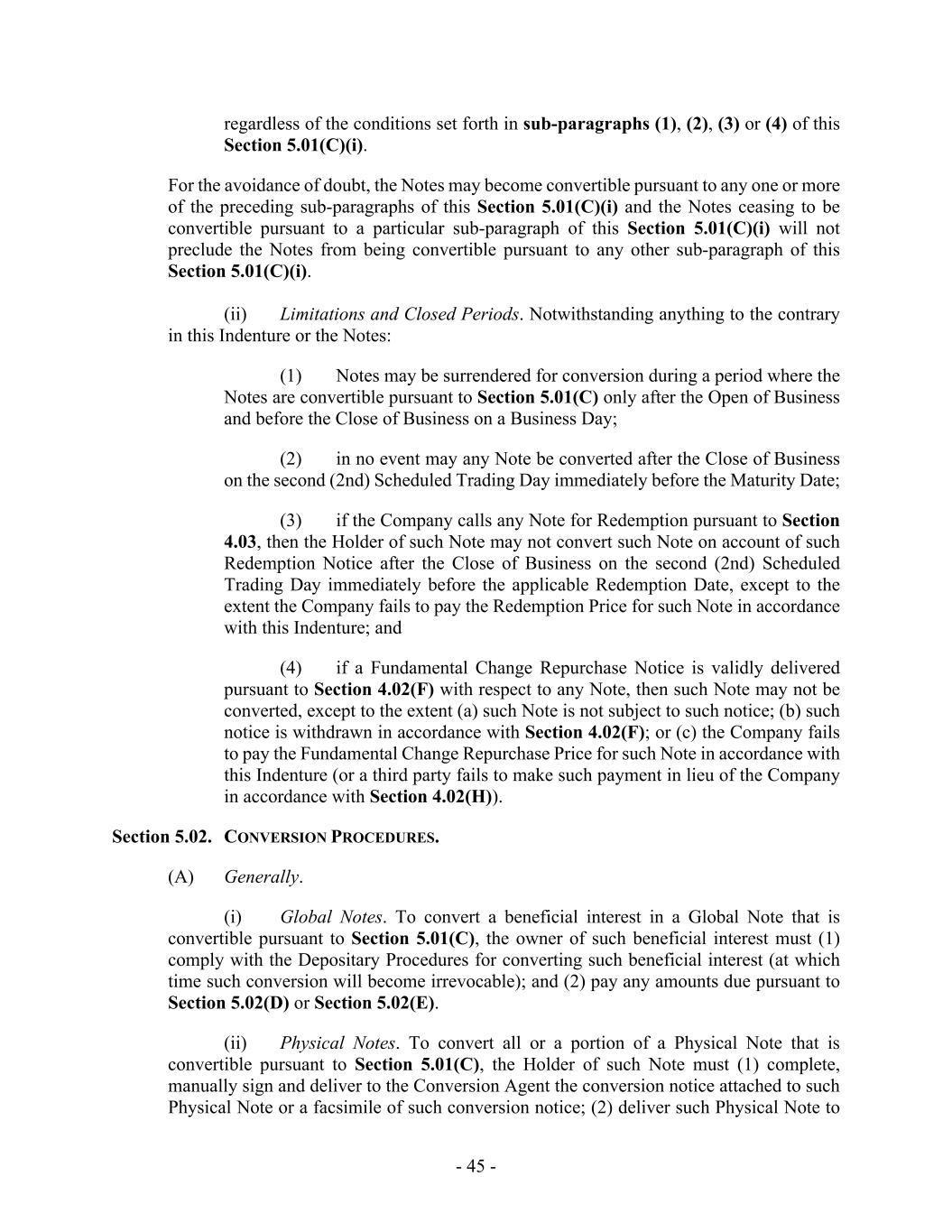 - 45 - regardless of the conditions set forth in sub-paragraphs (1), (2), (3) or (4) of this Section 5.01(C)(i). For the avoidance of doubt, the Notes may become convertible pursuant to any one or more of the preceding sub-paragraphs of this Section 5.01(C)(i) and the Notes ceasing to be convertible pursuant to a particular sub-paragraph of this Section 5.01(C)(i) will not preclude the Notes from being convertible pursuant to any other sub-paragraph of this Section 5.01(C)(i). (ii) Limitations and Closed Periods. Notwithstanding anything to the contrary in this Indenture or the Notes: (1) Notes may be surrendered for conversion during a period where the Notes are convertible pursuant to Section 5.01(C) only after the Open of Business and before the Close of Business on a Business Day; (2) in no event may any Note be converted after the Close of Business on the second (2nd) Scheduled Trading Day immediately before the Maturity Date; (3) if the Company calls any Note for Redemption pursuant to Section 4.03, then the Holder of such Note may not convert such Note on account of such Redemption Notice after the Close of Business on the second (2nd) Scheduled Trading Day immediately before the applicable Redemption Date, except to the extent the Company fails to pay the Redemption Price for such Note in accordance with this Indenture; and (4) if a Fundamental Change Repurchase Notice is validly delivered pursuant to Section 4.02(F) with respect to any Note, then such Note may not be converted, except to the extent (a) such Note is not subject to such notice; (b) such notice is withdrawn in accordance with Section 4.02(F); or (c) the Company fails to pay the Fundamental Change Repurchase Price for such Note in accordance with this Indenture (or a third party fails to make such payment in lieu of the Company in accordance with Section 4.02(H)). Section 5.02. CONVERSION PROCEDURES. (A) Generally. (i) Global Notes. To convert a beneficial interest in a Global Note that is convertible pursuant to Section 5.01(C), the owner of such beneficial interest must (1) comply with the Depositary Procedures for converting such beneficial interest (at which time such conversion will become irrevocable); and (2) pay any amounts due pursuant to Section 5.02(D) or Section 5.02(E). (ii) Physical Notes. To convert all or a portion of a Physical Note that is convertible pursuant to Section 5.01(C), the Holder of such Note must (1) complete, manually sign and deliver to the Conversion Agent the conversion notice attached to such Physical Note or a facsimile of such conversion notice; (2) deliver such Physical Note to