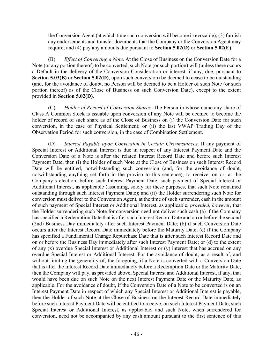 - 46 - the Conversion Agent (at which time such conversion will become irrevocable); (3) furnish any endorsements and transfer documents that the Company or the Conversion Agent may require; and (4) pay any amounts due pursuant to Section 5.02(D) or Section 5.02(E). (B) Effect of Converting a Note. At the Close of Business on the Conversion Date for a Note (or any portion thereof) to be converted, such Note (or such portion) will (unless there occurs a Default in the delivery of the Conversion Consideration or interest, if any, due, pursuant to Section 5.03(B) or Section 5.02(D), upon such conversion) be deemed to cease to be outstanding (and, for the avoidance of doubt, no Person will be deemed to be a Holder of such Note (or such portion thereof) as of the Close of Business on such Conversion Date), except to the extent provided in Section 5.02(D). (C) Holder of Record of Conversion Shares. The Person in whose name any share of Class A Common Stock is issuable upon conversion of any Note will be deemed to become the holder of record of such share as of the Close of Business on (i) the Conversion Date for such conversion, in the case of Physical Settlement; or (ii) the last VWAP Trading Day of the Observation Period for such conversion, in the case of Combination Settlement. (D) Interest Payable upon Conversion in Certain Circumstances. If any payment of Special Interest or Additional Interest is due in respect of any Interest Payment Date and the Conversion Date of a Note is after the related Interest Record Date and before such Interest Payment Date, then (i) the Holder of such Note at the Close of Business on such Interest Record Date will be entitled, notwithstanding such conversion (and, for the avoidance of doubt, notwithstanding anything set forth in the proviso to this sentence), to receive, on or, at the Company’s election, before such Interest Payment Date, such payment of Special Interest or Additional Interest, as applicable (assuming, solely for these purposes, that such Note remained outstanding through such Interest Payment Date); and (ii) the Holder surrendering such Note for conversion must deliver to the Conversion Agent, at the time of such surrender, cash in the amount of such payment of Special Interest or Additional Interest, as applicable; provided, however, that the Holder surrendering such Note for conversion need not deliver such cash (a) if the Company has specified a Redemption Date that is after such Interest Record Date and on or before the second (2nd) Business Day immediately after such Interest Payment Date; (b) if such Conversion Date occurs after the Interest Record Date immediately before the Maturity Date; (c) if the Company has specified a Fundamental Change Repurchase Date that is after such Interest Record Date and on or before the Business Day immediately after such Interest Payment Date; or (d) to the extent of any (x) overdue Special Interest or Additional Interest or (y) interest that has accrued on any overdue Special Interest or Additional Interest. For the avoidance of doubt, as a result of, and without limiting the generality of, the foregoing, if a Note is converted with a Conversion Date that is after the Interest Record Date immediately before a Redemption Date or the Maturity Date, then the Company will pay, as provided above, Special Interest and Additional Interest, if any, that would have been due on such Note on the next Interest Payment Date or the Maturity Date, as applicable. For the avoidance of doubt, if the Conversion Date of a Note to be converted is on an Interest Payment Date in respect of which any Special Interest or Additional Interest is payable, then the Holder of such Note at the Close of Business on the Interest Record Date immediately before such Interest Payment Date will be entitled to receive, on such Interest Payment Date, such Special Interest or Additional Interest, as applicable, and such Note, when surrendered for conversion, need not be accompanied by any cash amount pursuant to the first sentence of this