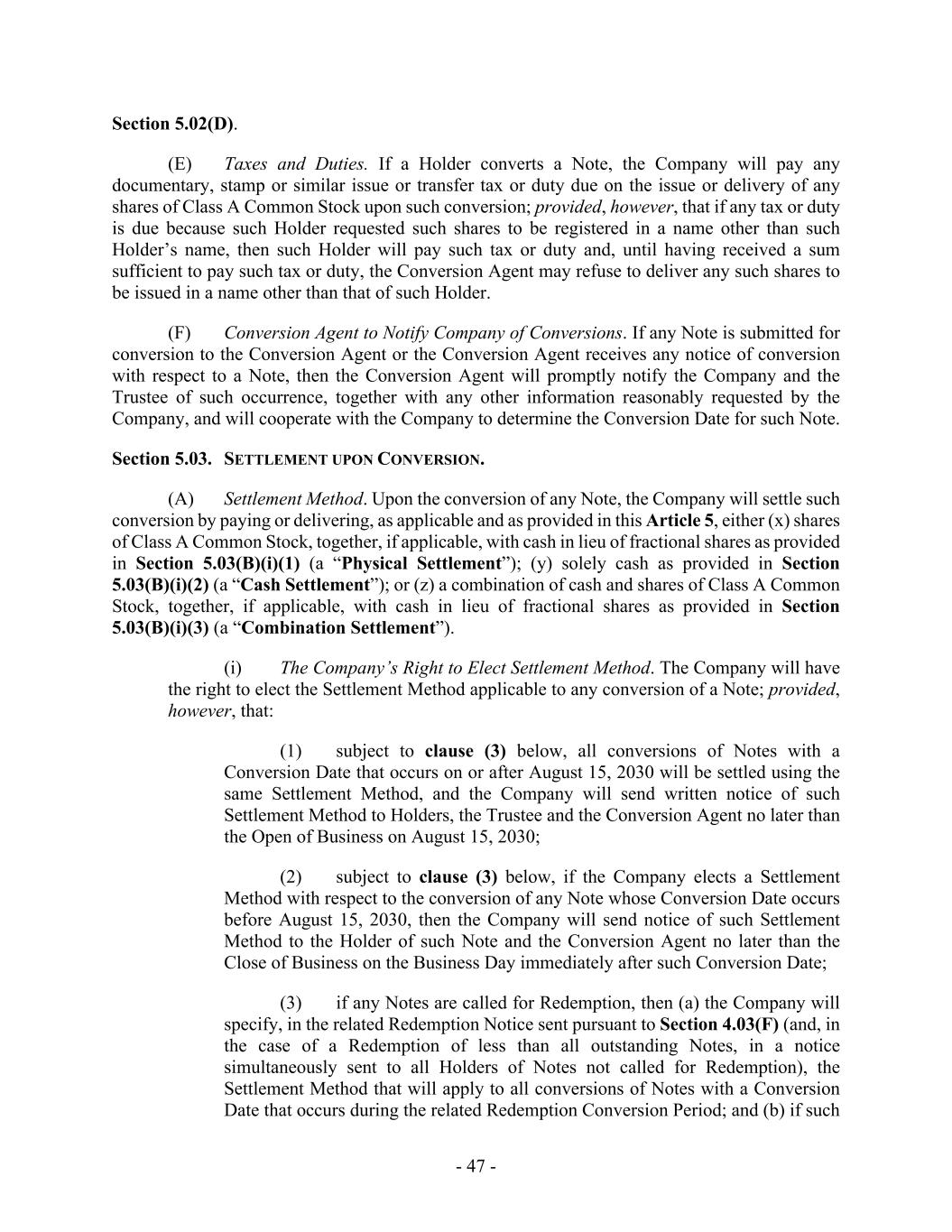 - 47 - Section 5.02(D). (E) Taxes and Duties. If a Holder converts a Note, the Company will pay any documentary, stamp or similar issue or transfer tax or duty due on the issue or delivery of any shares of Class A Common Stock upon such conversion; provided, however, that if any tax or duty is due because such Holder requested such shares to be registered in a name other than such Holder’s name, then such Holder will pay such tax or duty and, until having received a sum sufficient to pay such tax or duty, the Conversion Agent may refuse to deliver any such shares to be issued in a name other than that of such Holder. (F) Conversion Agent to Notify Company of Conversions. If any Note is submitted for conversion to the Conversion Agent or the Conversion Agent receives any notice of conversion with respect to a Note, then the Conversion Agent will promptly notify the Company and the Trustee of such occurrence, together with any other information reasonably requested by the Company, and will cooperate with the Company to determine the Conversion Date for such Note. Section 5.03. SETTLEMENT UPON CONVERSION. (A) Settlement Method. Upon the conversion of any Note, the Company will settle such conversion by paying or delivering, as applicable and as provided in this Article 5, either (x) shares of Class A Common Stock, together, if applicable, with cash in lieu of fractional shares as provided in Section 5.03(B)(i)(1) (a “Physical Settlement”); (y) solely cash as provided in Section 5.03(B)(i)(2) (a “Cash Settlement”); or (z) a combination of cash and shares of Class A Common Stock, together, if applicable, with cash in lieu of fractional shares as provided in Section 5.03(B)(i)(3) (a “Combination Settlement”). (i) The Company’s Right to Elect Settlement Method. The Company will have the right to elect the Settlement Method applicable to any conversion of a Note; provided, however, that: (1) subject to clause (3) below, all conversions of Notes with a Conversion Date that occurs on or after August 15, 2030 will be settled using the same Settlement Method, and the Company will send written notice of such Settlement Method to Holders, the Trustee and the Conversion Agent no later than the Open of Business on August 15, 2030; (2) subject to clause (3) below, if the Company elects a Settlement Method with respect to the conversion of any Note whose Conversion Date occurs before August 15, 2030, then the Company will send notice of such Settlement Method to the Holder of such Note and the Conversion Agent no later than the Close of Business on the Business Day immediately after such Conversion Date; (3) if any Notes are called for Redemption, then (a) the Company will specify, in the related Redemption Notice sent pursuant to Section 4.03(F) (and, in the case of a Redemption of less than all outstanding Notes, in a notice simultaneously sent to all Holders of Notes not called for Redemption), the Settlement Method that will apply to all conversions of Notes with a Conversion Date that occurs during the related Redemption Conversion Period; and (b) if such