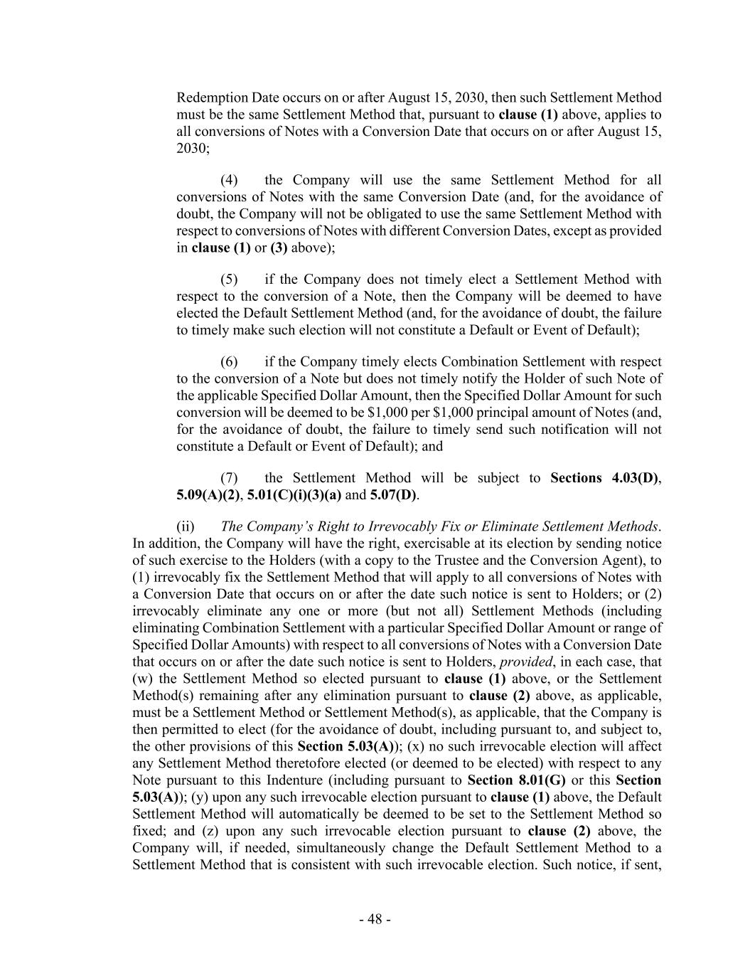 - 48 - Redemption Date occurs on or after August 15, 2030, then such Settlement Method must be the same Settlement Method that, pursuant to clause (1) above, applies to all conversions of Notes with a Conversion Date that occurs on or after August 15, 2030; (4) the Company will use the same Settlement Method for all conversions of Notes with the same Conversion Date (and, for the avoidance of doubt, the Company will not be obligated to use the same Settlement Method with respect to conversions of Notes with different Conversion Dates, except as provided in clause (1) or (3) above); (5) if the Company does not timely elect a Settlement Method with respect to the conversion of a Note, then the Company will be deemed to have elected the Default Settlement Method (and, for the avoidance of doubt, the failure to timely make such election will not constitute a Default or Event of Default); (6) if the Company timely elects Combination Settlement with respect to the conversion of a Note but does not timely notify the Holder of such Note of the applicable Specified Dollar Amount, then the Specified Dollar Amount for such conversion will be deemed to be $1,000 per $1,000 principal amount of Notes (and, for the avoidance of doubt, the failure to timely send such notification will not constitute a Default or Event of Default); and (7) the Settlement Method will be subject to Sections 4.03(D), 5.09(A)(2), 5.01(C)(i)(3)(a) and 5.07(D). (ii) The Company’s Right to Irrevocably Fix or Eliminate Settlement Methods. In addition, the Company will have the right, exercisable at its election by sending notice of such exercise to the Holders (with a copy to the Trustee and the Conversion Agent), to (1) irrevocably fix the Settlement Method that will apply to all conversions of Notes with a Conversion Date that occurs on or after the date such notice is sent to Holders; or (2) irrevocably eliminate any one or more (but not all) Settlement Methods (including eliminating Combination Settlement with a particular Specified Dollar Amount or range of Specified Dollar Amounts) with respect to all conversions of Notes with a Conversion Date that occurs on or after the date such notice is sent to Holders, provided, in each case, that (w) the Settlement Method so elected pursuant to clause (1) above, or the Settlement Method(s) remaining after any elimination pursuant to clause (2) above, as applicable, must be a Settlement Method or Settlement Method(s), as applicable, that the Company is then permitted to elect (for the avoidance of doubt, including pursuant to, and subject to, the other provisions of this Section 5.03(A)); (x) no such irrevocable election will affect any Settlement Method theretofore elected (or deemed to be elected) with respect to any Note pursuant to this Indenture (including pursuant to Section 8.01(G) or this Section 5.03(A)); (y) upon any such irrevocable election pursuant to clause (1) above, the Default Settlement Method will automatically be deemed to be set to the Settlement Method so fixed; and (z) upon any such irrevocable election pursuant to clause (2) above, the Company will, if needed, simultaneously change the Default Settlement Method to a Settlement Method that is consistent with such irrevocable election. Such notice, if sent,
