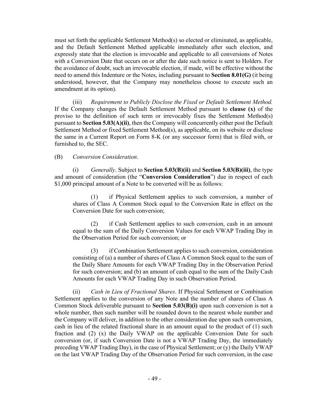 - 49 - must set forth the applicable Settlement Method(s) so elected or eliminated, as applicable, and the Default Settlement Method applicable immediately after such election, and expressly state that the election is irrevocable and applicable to all conversions of Notes with a Conversion Date that occurs on or after the date such notice is sent to Holders. For the avoidance of doubt, such an irrevocable election, if made, will be effective without the need to amend this Indenture or the Notes, including pursuant to Section 8.01(G) (it being understood, however, that the Company may nonetheless choose to execute such an amendment at its option). (iii) Requirement to Publicly Disclose the Fixed or Default Settlement Method. If the Company changes the Default Settlement Method pursuant to clause (x) of the proviso to the definition of such term or irrevocably fixes the Settlement Method(s) pursuant to Section 5.03(A)(ii), then the Company will concurrently either post the Default Settlement Method or fixed Settlement Method(s), as applicable, on its website or disclose the same in a Current Report on Form 8-K (or any successor form) that is filed with, or furnished to, the SEC. (B) Conversion Consideration. (i) Generally. Subject to Section 5.03(B)(ii) and Section 5.03(B)(iii), the type and amount of consideration (the “Conversion Consideration”) due in respect of each $1,000 principal amount of a Note to be converted will be as follows: (1) if Physical Settlement applies to such conversion, a number of shares of Class A Common Stock equal to the Conversion Rate in effect on the Conversion Date for such conversion; (2) if Cash Settlement applies to such conversion, cash in an amount equal to the sum of the Daily Conversion Values for each VWAP Trading Day in the Observation Period for such conversion; or (3) if Combination Settlement applies to such conversion, consideration consisting of (a) a number of shares of Class A Common Stock equal to the sum of the Daily Share Amounts for each VWAP Trading Day in the Observation Period for such conversion; and (b) an amount of cash equal to the sum of the Daily Cash Amounts for each VWAP Trading Day in such Observation Period. (ii) Cash in Lieu of Fractional Shares. If Physical Settlement or Combination Settlement applies to the conversion of any Note and the number of shares of Class A Common Stock deliverable pursuant to Section 5.03(B)(i) upon such conversion is not a whole number, then such number will be rounded down to the nearest whole number and the Company will deliver, in addition to the other consideration due upon such conversion, cash in lieu of the related fractional share in an amount equal to the product of (1) such fraction and (2) (x) the Daily VWAP on the applicable Conversion Date for such conversion (or, if such Conversion Date is not a VWAP Trading Day, the immediately preceding VWAP Trading Day), in the case of Physical Settlement; or (y) the Daily VWAP on the last VWAP Trading Day of the Observation Period for such conversion, in the case
