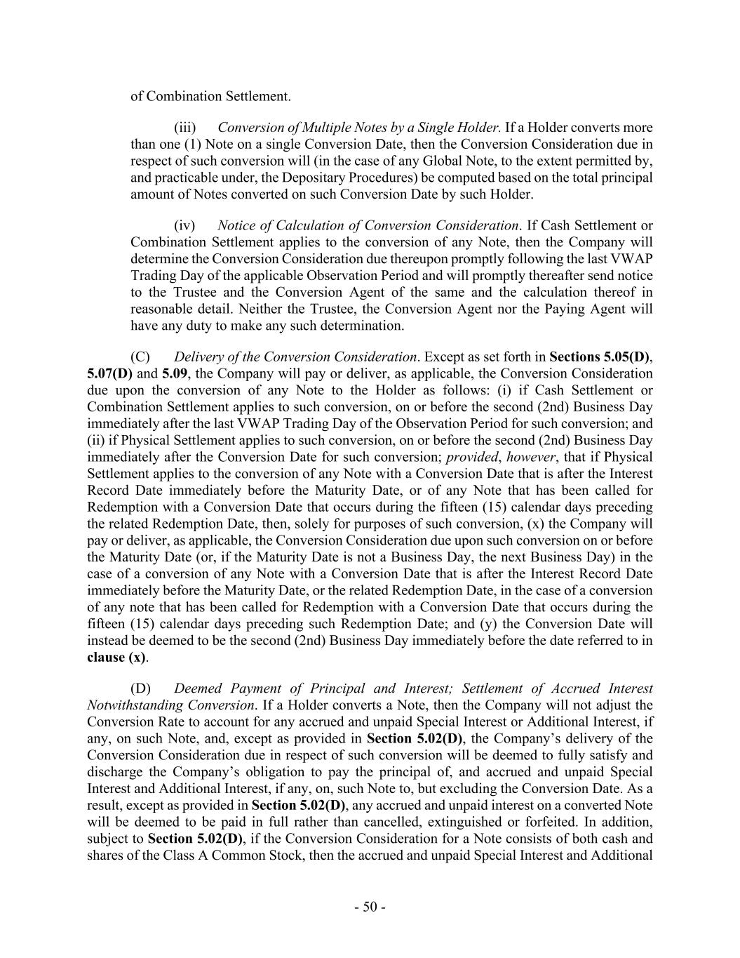 - 50 - of Combination Settlement. (iii) Conversion of Multiple Notes by a Single Holder. If a Holder converts more than one (1) Note on a single Conversion Date, then the Conversion Consideration due in respect of such conversion will (in the case of any Global Note, to the extent permitted by, and practicable under, the Depositary Procedures) be computed based on the total principal amount of Notes converted on such Conversion Date by such Holder. (iv) Notice of Calculation of Conversion Consideration. If Cash Settlement or Combination Settlement applies to the conversion of any Note, then the Company will determine the Conversion Consideration due thereupon promptly following the last VWAP Trading Day of the applicable Observation Period and will promptly thereafter send notice to the Trustee and the Conversion Agent of the same and the calculation thereof in reasonable detail. Neither the Trustee, the Conversion Agent nor the Paying Agent will have any duty to make any such determination. (C) Delivery of the Conversion Consideration. Except as set forth in Sections 5.05(D), 5.07(D) and 5.09, the Company will pay or deliver, as applicable, the Conversion Consideration due upon the conversion of any Note to the Holder as follows: (i) if Cash Settlement or Combination Settlement applies to such conversion, on or before the second (2nd) Business Day immediately after the last VWAP Trading Day of the Observation Period for such conversion; and (ii) if Physical Settlement applies to such conversion, on or before the second (2nd) Business Day immediately after the Conversion Date for such conversion; provided, however, that if Physical Settlement applies to the conversion of any Note with a Conversion Date that is after the Interest Record Date immediately before the Maturity Date, or of any Note that has been called for Redemption with a Conversion Date that occurs during the fifteen (15) calendar days preceding the related Redemption Date, then, solely for purposes of such conversion, (x) the Company will pay or deliver, as applicable, the Conversion Consideration due upon such conversion on or before the Maturity Date (or, if the Maturity Date is not a Business Day, the next Business Day) in the case of a conversion of any Note with a Conversion Date that is after the Interest Record Date immediately before the Maturity Date, or the related Redemption Date, in the case of a conversion of any note that has been called for Redemption with a Conversion Date that occurs during the fifteen (15) calendar days preceding such Redemption Date; and (y) the Conversion Date will instead be deemed to be the second (2nd) Business Day immediately before the date referred to in clause (x). (D) Deemed Payment of Principal and Interest; Settlement of Accrued Interest Notwithstanding Conversion. If a Holder converts a Note, then the Company will not adjust the Conversion Rate to account for any accrued and unpaid Special Interest or Additional Interest, if any, on such Note, and, except as provided in Section 5.02(D), the Company’s delivery of the Conversion Consideration due in respect of such conversion will be deemed to fully satisfy and discharge the Company’s obligation to pay the principal of, and accrued and unpaid Special Interest and Additional Interest, if any, on, such Note to, but excluding the Conversion Date. As a result, except as provided in Section 5.02(D), any accrued and unpaid interest on a converted Note will be deemed to be paid in full rather than cancelled, extinguished or forfeited. In addition, subject to Section 5.02(D), if the Conversion Consideration for a Note consists of both cash and shares of the Class A Common Stock, then the accrued and unpaid Special Interest and Additional