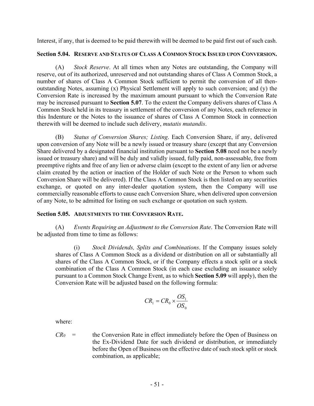 - 51 - Interest, if any, that is deemed to be paid therewith will be deemed to be paid first out of such cash. Section 5.04. RESERVE AND STATUS OF CLASS A COMMON STOCK ISSUED UPON CONVERSION. (A) Stock Reserve. At all times when any Notes are outstanding, the Company will reserve, out of its authorized, unreserved and not outstanding shares of Class A Common Stock, a number of shares of Class A Common Stock sufficient to permit the conversion of all then- outstanding Notes, assuming (x) Physical Settlement will apply to such conversion; and (y) the Conversion Rate is increased by the maximum amount pursuant to which the Conversion Rate may be increased pursuant to Section 5.07. To the extent the Company delivers shares of Class A Common Stock held in its treasury in settlement of the conversion of any Notes, each reference in this Indenture or the Notes to the issuance of shares of Class A Common Stock in connection therewith will be deemed to include such delivery, mutatis mutandis. (B) Status of Conversion Shares; Listing. Each Conversion Share, if any, delivered upon conversion of any Note will be a newly issued or treasury share (except that any Conversion Share delivered by a designated financial institution pursuant to Section 5.08 need not be a newly issued or treasury share) and will be duly and validly issued, fully paid, non-assessable, free from preemptive rights and free of any lien or adverse claim (except to the extent of any lien or adverse claim created by the action or inaction of the Holder of such Note or the Person to whom such Conversion Share will be delivered). If the Class A Common Stock is then listed on any securities exchange, or quoted on any inter-dealer quotation system, then the Company will use commercially reasonable efforts to cause each Conversion Share, when delivered upon conversion of any Note, to be admitted for listing on such exchange or quotation on such system. Section 5.05. ADJUSTMENTS TO THE CONVERSION RATE. (A) Events Requiring an Adjustment to the Conversion Rate. The Conversion Rate will be adjusted from time to time as follows: (i) Stock Dividends, Splits and Combinations. If the Company issues solely shares of Class A Common Stock as a dividend or distribution on all or substantially all shares of the Class A Common Stock, or if the Company effects a stock split or a stock combination of the Class A Common Stock (in each case excluding an issuance solely pursuant to a Common Stock Change Event, as to which Section 5.09 will apply), then the Conversion Rate will be adjusted based on the following formula: 0 1 01 OS OSCRCR ×= where: CR0 = the Conversion Rate in effect immediately before the Open of Business on the Ex-Dividend Date for such dividend or distribution, or immediately before the Open of Business on the effective date of such stock split or stock combination, as applicable;