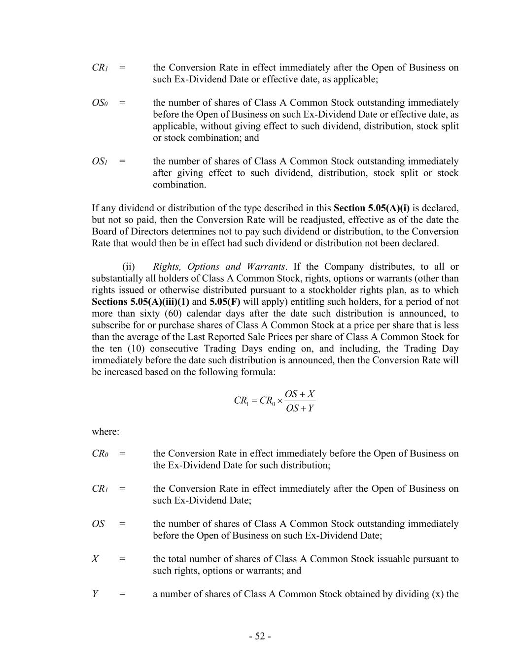 - 52 - CR1 = the Conversion Rate in effect immediately after the Open of Business on such Ex-Dividend Date or effective date, as applicable; OS0 = the number of shares of Class A Common Stock outstanding immediately before the Open of Business on such Ex-Dividend Date or effective date, as applicable, without giving effect to such dividend, distribution, stock split or stock combination; and OS1 = the number of shares of Class A Common Stock outstanding immediately after giving effect to such dividend, distribution, stock split or stock combination. If any dividend or distribution of the type described in this Section 5.05(A)(i) is declared, but not so paid, then the Conversion Rate will be readjusted, effective as of the date the Board of Directors determines not to pay such dividend or distribution, to the Conversion Rate that would then be in effect had such dividend or distribution not been declared. (ii) Rights, Options and Warrants. If the Company distributes, to all or substantially all holders of Class A Common Stock, rights, options or warrants (other than rights issued or otherwise distributed pursuant to a stockholder rights plan, as to which Sections 5.05(A)(iii)(1) and 5.05(F) will apply) entitling such holders, for a period of not more than sixty (60) calendar days after the date such distribution is announced, to subscribe for or purchase shares of Class A Common Stock at a price per share that is less than the average of the Last Reported Sale Prices per share of Class A Common Stock for the ten (10) consecutive Trading Days ending on, and including, the Trading Day immediately before the date such distribution is announced, then the Conversion Rate will be increased based on the following formula: YOS XOSCRCR + + ×= 01 where: CR0 = the Conversion Rate in effect immediately before the Open of Business on the Ex-Dividend Date for such distribution; CR1 = the Conversion Rate in effect immediately after the Open of Business on such Ex-Dividend Date; OS = the number of shares of Class A Common Stock outstanding immediately before the Open of Business on such Ex-Dividend Date; X = the total number of shares of Class A Common Stock issuable pursuant to such rights, options or warrants; and Y = a number of shares of Class A Common Stock obtained by dividing (x) the