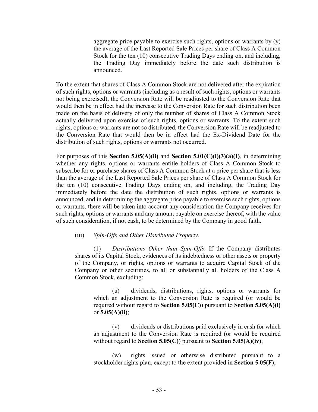 - 53 - aggregate price payable to exercise such rights, options or warrants by (y) the average of the Last Reported Sale Prices per share of Class A Common Stock for the ten (10) consecutive Trading Days ending on, and including, the Trading Day immediately before the date such distribution is announced. To the extent that shares of Class A Common Stock are not delivered after the expiration of such rights, options or warrants (including as a result of such rights, options or warrants not being exercised), the Conversion Rate will be readjusted to the Conversion Rate that would then be in effect had the increase to the Conversion Rate for such distribution been made on the basis of delivery of only the number of shares of Class A Common Stock actually delivered upon exercise of such rights, options or warrants. To the extent such rights, options or warrants are not so distributed, the Conversion Rate will be readjusted to the Conversion Rate that would then be in effect had the Ex-Dividend Date for the distribution of such rights, options or warrants not occurred. For purposes of this Section 5.05(A)(ii) and Section 5.01(C)(i)(3)(a)(I), in determining whether any rights, options or warrants entitle holders of Class A Common Stock to subscribe for or purchase shares of Class A Common Stock at a price per share that is less than the average of the Last Reported Sale Prices per share of Class A Common Stock for the ten (10) consecutive Trading Days ending on, and including, the Trading Day immediately before the date the distribution of such rights, options or warrants is announced, and in determining the aggregate price payable to exercise such rights, options or warrants, there will be taken into account any consideration the Company receives for such rights, options or warrants and any amount payable on exercise thereof, with the value of such consideration, if not cash, to be determined by the Company in good faith. (iii) Spin-Offs and Other Distributed Property. (1) Distributions Other than Spin-Offs. If the Company distributes shares of its Capital Stock, evidences of its indebtedness or other assets or property of the Company, or rights, options or warrants to acquire Capital Stock of the Company or other securities, to all or substantially all holders of the Class A Common Stock, excluding: (u) dividends, distributions, rights, options or warrants for which an adjustment to the Conversion Rate is required (or would be required without regard to Section 5.05(C)) pursuant to Section 5.05(A)(i) or 5.05(A)(ii); (v) dividends or distributions paid exclusively in cash for which an adjustment to the Conversion Rate is required (or would be required without regard to Section 5.05(C)) pursuant to Section 5.05(A)(iv); (w) rights issued or otherwise distributed pursuant to a stockholder rights plan, except to the extent provided in Section 5.05(F);