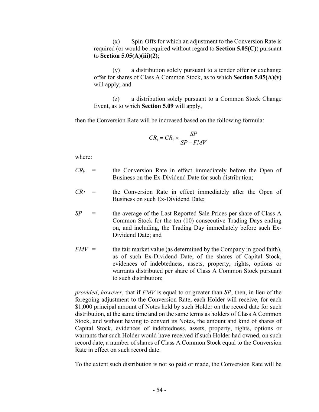 - 54 - (x) Spin-Offs for which an adjustment to the Conversion Rate is required (or would be required without regard to Section 5.05(C)) pursuant to Section 5.05(A)(iii)(2); (y) a distribution solely pursuant to a tender offer or exchange offer for shares of Class A Common Stock, as to which Section 5.05(A)(v) will apply; and (z) a distribution solely pursuant to a Common Stock Change Event, as to which Section 5.09 will apply, then the Conversion Rate will be increased based on the following formula: FMVSP SPCRCR − ×= 01 where: CR0 = the Conversion Rate in effect immediately before the Open of Business on the Ex-Dividend Date for such distribution; CR1 = the Conversion Rate in effect immediately after the Open of Business on such Ex-Dividend Date; SP = the average of the Last Reported Sale Prices per share of Class A Common Stock for the ten (10) consecutive Trading Days ending on, and including, the Trading Day immediately before such Ex- Dividend Date; and FMV = the fair market value (as determined by the Company in good faith), as of such Ex-Dividend Date, of the shares of Capital Stock, evidences of indebtedness, assets, property, rights, options or warrants distributed per share of Class A Common Stock pursuant to such distribution; provided, however, that if FMV is equal to or greater than SP, then, in lieu of the foregoing adjustment to the Conversion Rate, each Holder will receive, for each $1,000 principal amount of Notes held by such Holder on the record date for such distribution, at the same time and on the same terms as holders of Class A Common Stock, and without having to convert its Notes, the amount and kind of shares of Capital Stock, evidences of indebtedness, assets, property, rights, options or warrants that such Holder would have received if such Holder had owned, on such record date, a number of shares of Class A Common Stock equal to the Conversion Rate in effect on such record date. To the extent such distribution is not so paid or made, the Conversion Rate will be