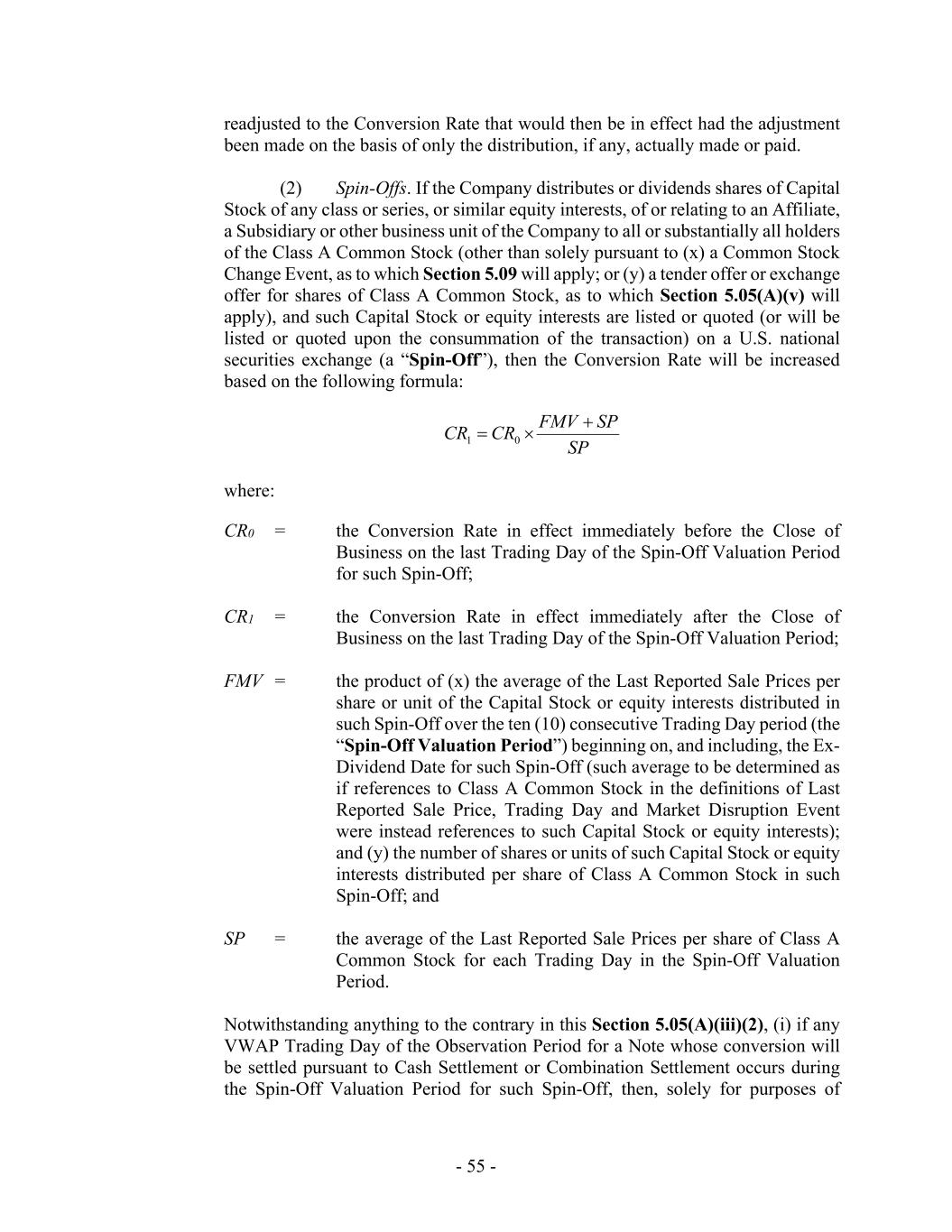 - 55 - readjusted to the Conversion Rate that would then be in effect had the adjustment been made on the basis of only the distribution, if any, actually made or paid. (2) Spin-Offs. If the Company distributes or dividends shares of Capital Stock of any class or series, or similar equity interests, of or relating to an Affiliate, a Subsidiary or other business unit of the Company to all or substantially all holders of the Class A Common Stock (other than solely pursuant to (x) a Common Stock Change Event, as to which Section 5.09 will apply; or (y) a tender offer or exchange offer for shares of Class A Common Stock, as to which Section 5.05(A)(v) will apply), and such Capital Stock or equity interests are listed or quoted (or will be listed or quoted upon the consummation of the transaction) on a U.S. national securities exchange (a “Spin-Off”), then the Conversion Rate will be increased based on the following formula: SP SPFMVCRCR + ×= 01 where: CR0 = the Conversion Rate in effect immediately before the Close of Business on the last Trading Day of the Spin-Off Valuation Period for such Spin-Off; CR1 = the Conversion Rate in effect immediately after the Close of Business on the last Trading Day of the Spin-Off Valuation Period; FMV = the product of (x) the average of the Last Reported Sale Prices per share or unit of the Capital Stock or equity interests distributed in such Spin-Off over the ten (10) consecutive Trading Day period (the “Spin-Off Valuation Period”) beginning on, and including, the Ex- Dividend Date for such Spin-Off (such average to be determined as if references to Class A Common Stock in the definitions of Last Reported Sale Price, Trading Day and Market Disruption Event were instead references to such Capital Stock or equity interests); and (y) the number of shares or units of such Capital Stock or equity interests distributed per share of Class A Common Stock in such Spin-Off; and SP = the average of the Last Reported Sale Prices per share of Class A Common Stock for each Trading Day in the Spin-Off Valuation Period. Notwithstanding anything to the contrary in this Section 5.05(A)(iii)(2), (i) if any VWAP Trading Day of the Observation Period for a Note whose conversion will be settled pursuant to Cash Settlement or Combination Settlement occurs during the Spin-Off Valuation Period for such Spin-Off, then, solely for purposes of