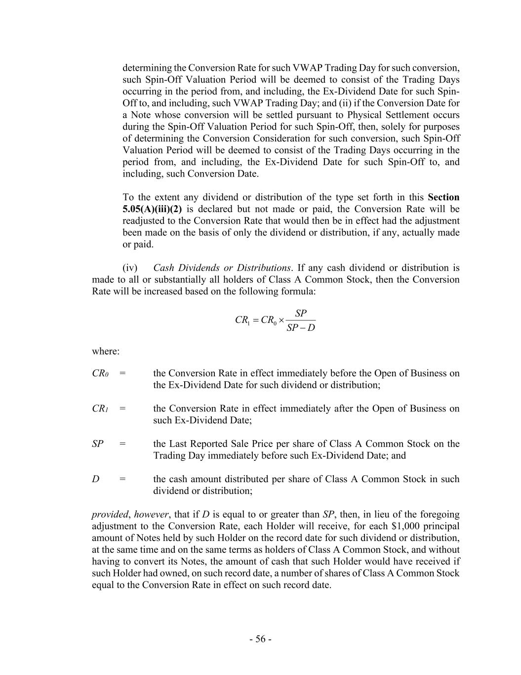 - 56 - determining the Conversion Rate for such VWAP Trading Day for such conversion, such Spin-Off Valuation Period will be deemed to consist of the Trading Days occurring in the period from, and including, the Ex-Dividend Date for such Spin- Off to, and including, such VWAP Trading Day; and (ii) if the Conversion Date for a Note whose conversion will be settled pursuant to Physical Settlement occurs during the Spin-Off Valuation Period for such Spin-Off, then, solely for purposes of determining the Conversion Consideration for such conversion, such Spin-Off Valuation Period will be deemed to consist of the Trading Days occurring in the period from, and including, the Ex-Dividend Date for such Spin-Off to, and including, such Conversion Date. To the extent any dividend or distribution of the type set forth in this Section 5.05(A)(iii)(2) is declared but not made or paid, the Conversion Rate will be readjusted to the Conversion Rate that would then be in effect had the adjustment been made on the basis of only the dividend or distribution, if any, actually made or paid. (iv) Cash Dividends or Distributions. If any cash dividend or distribution is made to all or substantially all holders of Class A Common Stock, then the Conversion Rate will be increased based on the following formula: DSP SPCRCR − ×= 01 where: CR0 = the Conversion Rate in effect immediately before the Open of Business on the Ex-Dividend Date for such dividend or distribution; CR1 = the Conversion Rate in effect immediately after the Open of Business on such Ex-Dividend Date; SP = the Last Reported Sale Price per share of Class A Common Stock on the Trading Day immediately before such Ex-Dividend Date; and D = the cash amount distributed per share of Class A Common Stock in such dividend or distribution; provided, however, that if D is equal to or greater than SP, then, in lieu of the foregoing adjustment to the Conversion Rate, each Holder will receive, for each $1,000 principal amount of Notes held by such Holder on the record date for such dividend or distribution, at the same time and on the same terms as holders of Class A Common Stock, and without having to convert its Notes, the amount of cash that such Holder would have received if such Holder had owned, on such record date, a number of shares of Class A Common Stock equal to the Conversion Rate in effect on such record date.