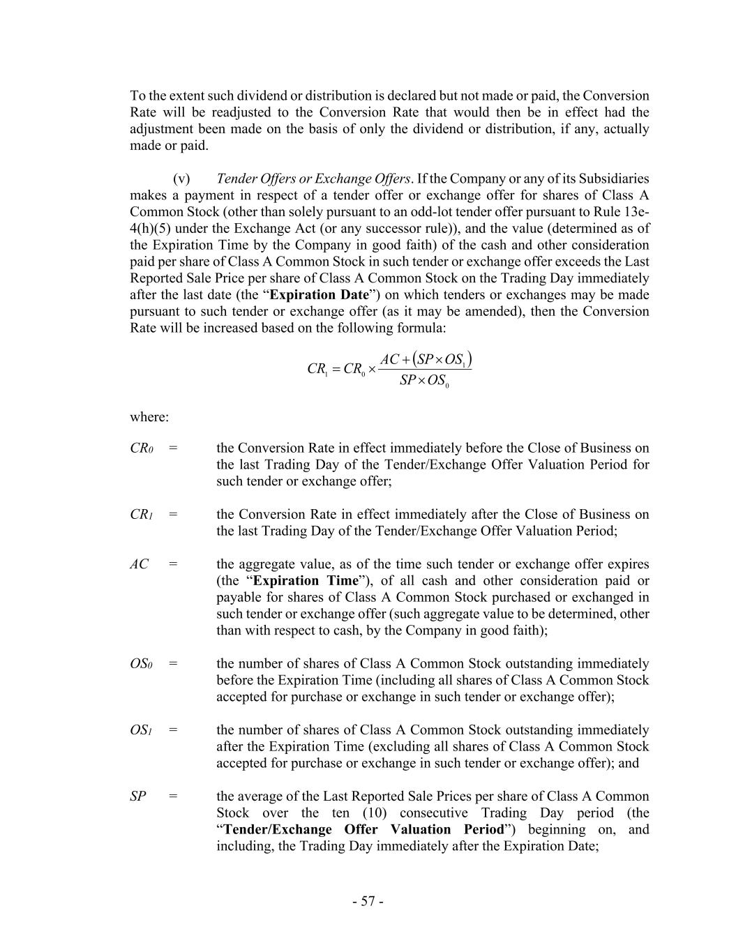 - 57 - To the extent such dividend or distribution is declared but not made or paid, the Conversion Rate will be readjusted to the Conversion Rate that would then be in effect had the adjustment been made on the basis of only the dividend or distribution, if any, actually made or paid. (v) Tender Offers or Exchange Offers. If the Company or any of its Subsidiaries makes a payment in respect of a tender offer or exchange offer for shares of Class A Common Stock (other than solely pursuant to an odd-lot tender offer pursuant to Rule 13e- 4(h)(5) under the Exchange Act (or any successor rule)), and the value (determined as of the Expiration Time by the Company in good faith) of the cash and other consideration paid per share of Class A Common Stock in such tender or exchange offer exceeds the Last Reported Sale Price per share of Class A Common Stock on the Trading Day immediately after the last date (the “Expiration Date”) on which tenders or exchanges may be made pursuant to such tender or exchange offer (as it may be amended), then the Conversion Rate will be increased based on the following formula: ( ) 0 1 01 OSSP OSSPACCRCR × ×+ ×= where: CR0 = the Conversion Rate in effect immediately before the Close of Business on the last Trading Day of the Tender/Exchange Offer Valuation Period for such tender or exchange offer; CR1 = the Conversion Rate in effect immediately after the Close of Business on the last Trading Day of the Tender/Exchange Offer Valuation Period; AC = the aggregate value, as of the time such tender or exchange offer expires (the “Expiration Time”), of all cash and other consideration paid or payable for shares of Class A Common Stock purchased or exchanged in such tender or exchange offer (such aggregate value to be determined, other than with respect to cash, by the Company in good faith); OS0 = the number of shares of Class A Common Stock outstanding immediately before the Expiration Time (including all shares of Class A Common Stock accepted for purchase or exchange in such tender or exchange offer); OS1 = the number of shares of Class A Common Stock outstanding immediately after the Expiration Time (excluding all shares of Class A Common Stock accepted for purchase or exchange in such tender or exchange offer); and SP = the average of the Last Reported Sale Prices per share of Class A Common Stock over the ten (10) consecutive Trading Day period (the “Tender/Exchange Offer Valuation Period”) beginning on, and including, the Trading Day immediately after the Expiration Date;