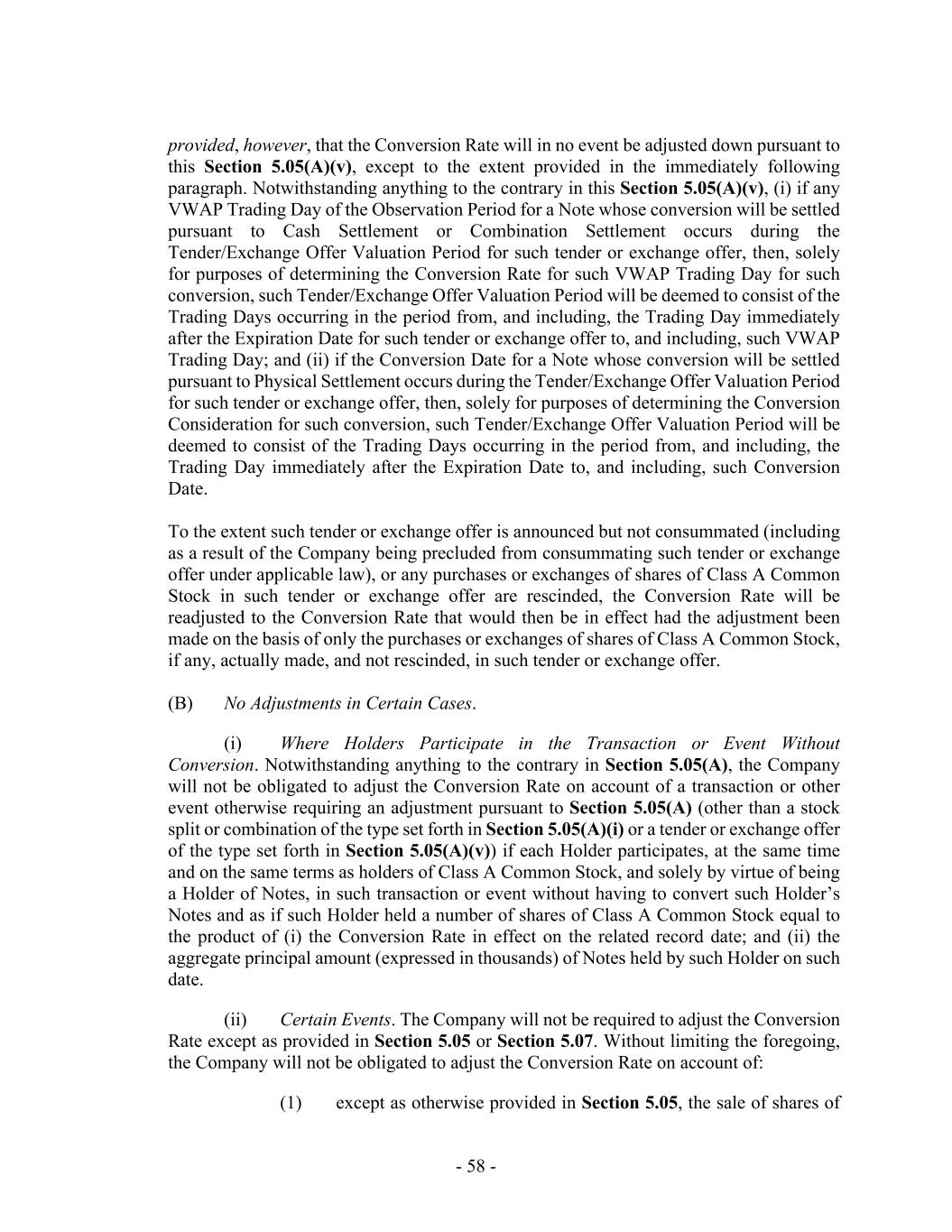 - 58 - provided, however, that the Conversion Rate will in no event be adjusted down pursuant to this Section 5.05(A)(v), except to the extent provided in the immediately following paragraph. Notwithstanding anything to the contrary in this Section 5.05(A)(v), (i) if any VWAP Trading Day of the Observation Period for a Note whose conversion will be settled pursuant to Cash Settlement or Combination Settlement occurs during the Tender/Exchange Offer Valuation Period for such tender or exchange offer, then, solely for purposes of determining the Conversion Rate for such VWAP Trading Day for such conversion, such Tender/Exchange Offer Valuation Period will be deemed to consist of the Trading Days occurring in the period from, and including, the Trading Day immediately after the Expiration Date for such tender or exchange offer to, and including, such VWAP Trading Day; and (ii) if the Conversion Date for a Note whose conversion will be settled pursuant to Physical Settlement occurs during the Tender/Exchange Offer Valuation Period for such tender or exchange offer, then, solely for purposes of determining the Conversion Consideration for such conversion, such Tender/Exchange Offer Valuation Period will be deemed to consist of the Trading Days occurring in the period from, and including, the Trading Day immediately after the Expiration Date to, and including, such Conversion Date. To the extent such tender or exchange offer is announced but not consummated (including as a result of the Company being precluded from consummating such tender or exchange offer under applicable law), or any purchases or exchanges of shares of Class A Common Stock in such tender or exchange offer are rescinded, the Conversion Rate will be readjusted to the Conversion Rate that would then be in effect had the adjustment been made on the basis of only the purchases or exchanges of shares of Class A Common Stock, if any, actually made, and not rescinded, in such tender or exchange offer. (B) No Adjustments in Certain Cases. (i) Where Holders Participate in the Transaction or Event Without Conversion. Notwithstanding anything to the contrary in Section 5.05(A), the Company will not be obligated to adjust the Conversion Rate on account of a transaction or other event otherwise requiring an adjustment pursuant to Section 5.05(A) (other than a stock split or combination of the type set forth in Section 5.05(A)(i) or a tender or exchange offer of the type set forth in Section 5.05(A)(v)) if each Holder participates, at the same time and on the same terms as holders of Class A Common Stock, and solely by virtue of being a Holder of Notes, in such transaction or event without having to convert such Holder’s Notes and as if such Holder held a number of shares of Class A Common Stock equal to the product of (i) the Conversion Rate in effect on the related record date; and (ii) the aggregate principal amount (expressed in thousands) of Notes held by such Holder on such date. (ii) Certain Events. The Company will not be required to adjust the Conversion Rate except as provided in Section 5.05 or Section 5.07. Without limiting the foregoing, the Company will not be obligated to adjust the Conversion Rate on account of: (1) except as otherwise provided in Section 5.05, the sale of shares of