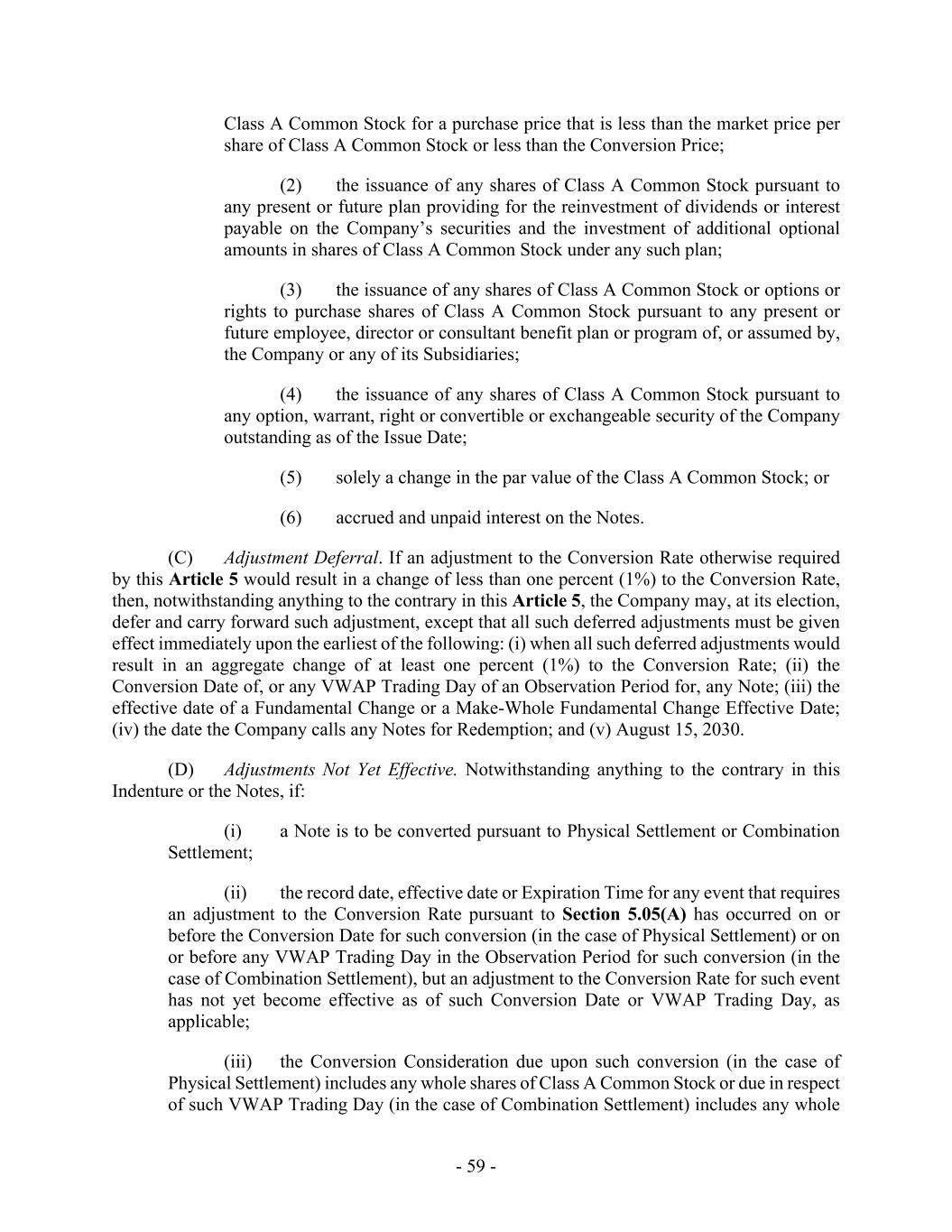 - 59 - Class A Common Stock for a purchase price that is less than the market price per share of Class A Common Stock or less than the Conversion Price; (2) the issuance of any shares of Class A Common Stock pursuant to any present or future plan providing for the reinvestment of dividends or interest payable on the Company’s securities and the investment of additional optional amounts in shares of Class A Common Stock under any such plan; (3) the issuance of any shares of Class A Common Stock or options or rights to purchase shares of Class A Common Stock pursuant to any present or future employee, director or consultant benefit plan or program of, or assumed by, the Company or any of its Subsidiaries; (4) the issuance of any shares of Class A Common Stock pursuant to any option, warrant, right or convertible or exchangeable security of the Company outstanding as of the Issue Date; (5) solely a change in the par value of the Class A Common Stock; or (6) accrued and unpaid interest on the Notes. (C) Adjustment Deferral. If an adjustment to the Conversion Rate otherwise required by this Article 5 would result in a change of less than one percent (1%) to the Conversion Rate, then, notwithstanding anything to the contrary in this Article 5, the Company may, at its election, defer and carry forward such adjustment, except that all such deferred adjustments must be given effect immediately upon the earliest of the following: (i) when all such deferred adjustments would result in an aggregate change of at least one percent (1%) to the Conversion Rate; (ii) the Conversion Date of, or any VWAP Trading Day of an Observation Period for, any Note; (iii) the effective date of a Fundamental Change or a Make-Whole Fundamental Change Effective Date; (iv) the date the Company calls any Notes for Redemption; and (v) August 15, 2030. (D) Adjustments Not Yet Effective. Notwithstanding anything to the contrary in this Indenture or the Notes, if: (i) a Note is to be converted pursuant to Physical Settlement or Combination Settlement; (ii) the record date, effective date or Expiration Time for any event that requires an adjustment to the Conversion Rate pursuant to Section 5.05(A) has occurred on or before the Conversion Date for such conversion (in the case of Physical Settlement) or on or before any VWAP Trading Day in the Observation Period for such conversion (in the case of Combination Settlement), but an adjustment to the Conversion Rate for such event has not yet become effective as of such Conversion Date or VWAP Trading Day, as applicable; (iii) the Conversion Consideration due upon such conversion (in the case of Physical Settlement) includes any whole shares of Class A Common Stock or due in respect of such VWAP Trading Day (in the case of Combination Settlement) includes any whole