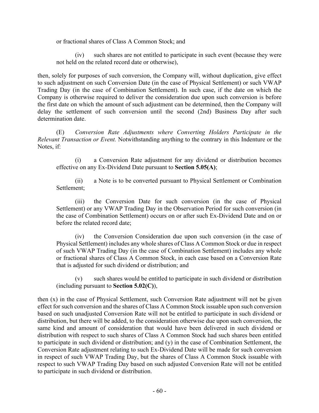 - 60 - or fractional shares of Class A Common Stock; and (iv) such shares are not entitled to participate in such event (because they were not held on the related record date or otherwise), then, solely for purposes of such conversion, the Company will, without duplication, give effect to such adjustment on such Conversion Date (in the case of Physical Settlement) or such VWAP Trading Day (in the case of Combination Settlement). In such case, if the date on which the Company is otherwise required to deliver the consideration due upon such conversion is before the first date on which the amount of such adjustment can be determined, then the Company will delay the settlement of such conversion until the second (2nd) Business Day after such determination date. (E) Conversion Rate Adjustments where Converting Holders Participate in the Relevant Transaction or Event. Notwithstanding anything to the contrary in this Indenture or the Notes, if: (i) a Conversion Rate adjustment for any dividend or distribution becomes effective on any Ex-Dividend Date pursuant to Section 5.05(A); (ii) a Note is to be converted pursuant to Physical Settlement or Combination Settlement; (iii) the Conversion Date for such conversion (in the case of Physical Settlement) or any VWAP Trading Day in the Observation Period for such conversion (in the case of Combination Settlement) occurs on or after such Ex-Dividend Date and on or before the related record date; (iv) the Conversion Consideration due upon such conversion (in the case of Physical Settlement) includes any whole shares of Class A Common Stock or due in respect of such VWAP Trading Day (in the case of Combination Settlement) includes any whole or fractional shares of Class A Common Stock, in each case based on a Conversion Rate that is adjusted for such dividend or distribution; and (v) such shares would be entitled to participate in such dividend or distribution (including pursuant to Section 5.02(C)), then (x) in the case of Physical Settlement, such Conversion Rate adjustment will not be given effect for such conversion and the shares of Class A Common Stock issuable upon such conversion based on such unadjusted Conversion Rate will not be entitled to participate in such dividend or distribution, but there will be added, to the consideration otherwise due upon such conversion, the same kind and amount of consideration that would have been delivered in such dividend or distribution with respect to such shares of Class A Common Stock had such shares been entitled to participate in such dividend or distribution; and (y) in the case of Combination Settlement, the Conversion Rate adjustment relating to such Ex-Dividend Date will be made for such conversion in respect of such VWAP Trading Day, but the shares of Class A Common Stock issuable with respect to such VWAP Trading Day based on such adjusted Conversion Rate will not be entitled to participate in such dividend or distribution.