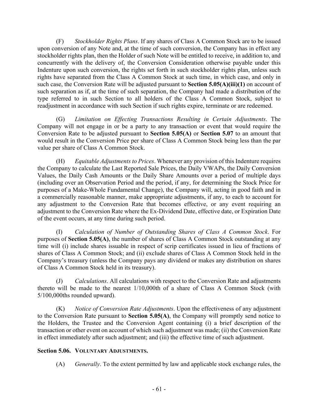 - 61 - (F) Stockholder Rights Plans. If any shares of Class A Common Stock are to be issued upon conversion of any Note and, at the time of such conversion, the Company has in effect any stockholder rights plan, then the Holder of such Note will be entitled to receive, in addition to, and concurrently with the delivery of, the Conversion Consideration otherwise payable under this Indenture upon such conversion, the rights set forth in such stockholder rights plan, unless such rights have separated from the Class A Common Stock at such time, in which case, and only in such case, the Conversion Rate will be adjusted pursuant to Section 5.05(A)(iii)(1) on account of such separation as if, at the time of such separation, the Company had made a distribution of the type referred to in such Section to all holders of the Class A Common Stock, subject to readjustment in accordance with such Section if such rights expire, terminate or are redeemed. (G) Limitation on Effecting Transactions Resulting in Certain Adjustments. The Company will not engage in or be a party to any transaction or event that would require the Conversion Rate to be adjusted pursuant to Section 5.05(A) or Section 5.07 to an amount that would result in the Conversion Price per share of Class A Common Stock being less than the par value per share of Class A Common Stock. (H) Equitable Adjustments to Prices. Whenever any provision of this Indenture requires the Company to calculate the Last Reported Sale Prices, the Daily VWAPs, the Daily Conversion Values, the Daily Cash Amounts or the Daily Share Amounts over a period of multiple days (including over an Observation Period and the period, if any, for determining the Stock Price for purposes of a Make-Whole Fundamental Change), the Company will, acting in good faith and in a commercially reasonable manner, make appropriate adjustments, if any, to each to account for any adjustment to the Conversion Rate that becomes effective, or any event requiring an adjustment to the Conversion Rate where the Ex-Dividend Date, effective date, or Expiration Date of the event occurs, at any time during such period. (I) Calculation of Number of Outstanding Shares of Class A Common Stock. For purposes of Section 5.05(A), the number of shares of Class A Common Stock outstanding at any time will (i) include shares issuable in respect of scrip certificates issued in lieu of fractions of shares of Class A Common Stock; and (ii) exclude shares of Class A Common Stock held in the Company’s treasury (unless the Company pays any dividend or makes any distribution on shares of Class A Common Stock held in its treasury). (J) Calculations. All calculations with respect to the Conversion Rate and adjustments thereto will be made to the nearest 1/10,000th of a share of Class A Common Stock (with 5/100,000ths rounded upward). (K) Notice of Conversion Rate Adjustments. Upon the effectiveness of any adjustment to the Conversion Rate pursuant to Section 5.05(A), the Company will promptly send notice to the Holders, the Trustee and the Conversion Agent containing (i) a brief description of the transaction or other event on account of which such adjustment was made; (ii) the Conversion Rate in effect immediately after such adjustment; and (iii) the effective time of such adjustment. Section 5.06. VOLUNTARY ADJUSTMENTS. (A) Generally. To the extent permitted by law and applicable stock exchange rules, the