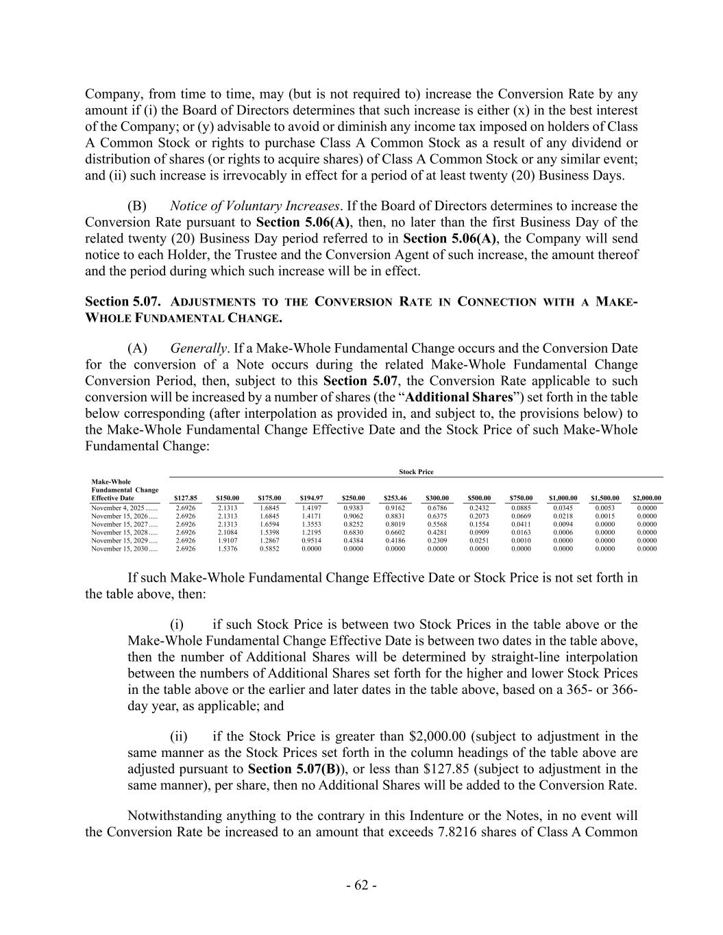 - 62 - Company, from time to time, may (but is not required to) increase the Conversion Rate by any amount if (i) the Board of Directors determines that such increase is either (x) in the best interest of the Company; or (y) advisable to avoid or diminish any income tax imposed on holders of Class A Common Stock or rights to purchase Class A Common Stock as a result of any dividend or distribution of shares (or rights to acquire shares) of Class A Common Stock or any similar event; and (ii) such increase is irrevocably in effect for a period of at least twenty (20) Business Days. (B) Notice of Voluntary Increases. If the Board of Directors determines to increase the Conversion Rate pursuant to Section 5.06(A), then, no later than the first Business Day of the related twenty (20) Business Day period referred to in Section 5.06(A), the Company will send notice to each Holder, the Trustee and the Conversion Agent of such increase, the amount thereof and the period during which such increase will be in effect. Section 5.07. ADJUSTMENTS TO THE CONVERSION RATE IN CONNECTION WITH A MAKE- WHOLE FUNDAMENTAL CHANGE. (A) Generally. If a Make-Whole Fundamental Change occurs and the Conversion Date for the conversion of a Note occurs during the related Make-Whole Fundamental Change Conversion Period, then, subject to this Section 5.07, the Conversion Rate applicable to such conversion will be increased by a number of shares (the “Additional Shares”) set forth in the table below corresponding (after interpolation as provided in, and subject to, the provisions below) to the Make-Whole Fundamental Change Effective Date and the Stock Price of such Make-Whole Fundamental Change: Stock Price Make-Whole Fundamental Change Effective Date $127.85 $150.00 $175.00 $194.97 $250.00 $253.46 $300.00 $500.00 $750.00 $1,000.00 $1,500.00 $2,000.00 November 4, 2025 ....... 2.6926 2.1313 1.6845 1.4197 0.9383 0.9162 0.6786 0.2432 0.0885 0.0345 0.0053 0.0000 November 15, 2026 ..... 2.6926 2.1313 1.6845 1.4171 0.9062 0.8831 0.6375 0.2073 0.0669 0.0218 0.0015 0.0000 November 15, 2027 ..... 2.6926 2.1313 1.6594 1.3553 0.8252 0.8019 0.5568 0.1554 0.0411 0.0094 0.0000 0.0000 November 15, 2028 ..... 2.6926 2.1084 1.5398 1.2195 0.6830 0.6602 0.4281 0.0909 0.0163 0.0006 0.0000 0.0000 November 15, 2029 ..... 2.6926 1.9107 1.2867 0.9514 0.4384 0.4186 0.2309 0.0251 0.0010 0.0000 0.0000 0.0000 November 15, 2030 ..... 2.6926 1.5376 0.5852 0.0000 0.0000 0.0000 0.0000 0.0000 0.0000 0.0000 0.0000 0.0000 If such Make-Whole Fundamental Change Effective Date or Stock Price is not set forth in the table above, then: (i) if such Stock Price is between two Stock Prices in the table above or the Make-Whole Fundamental Change Effective Date is between two dates in the table above, then the number of Additional Shares will be determined by straight-line interpolation between the numbers of Additional Shares set forth for the higher and lower Stock Prices in the table above or the earlier and later dates in the table above, based on a 365- or 366- day year, as applicable; and (ii) if the Stock Price is greater than $2,000.00 (subject to adjustment in the same manner as the Stock Prices set forth in the column headings of the table above are adjusted pursuant to Section 5.07(B)), or less than $127.85 (subject to adjustment in the same manner), per share, then no Additional Shares will be added to the Conversion Rate. Notwithstanding anything to the contrary in this Indenture or the Notes, in no event will the Conversion Rate be increased to an amount that exceeds 7.8216 shares of Class A Common