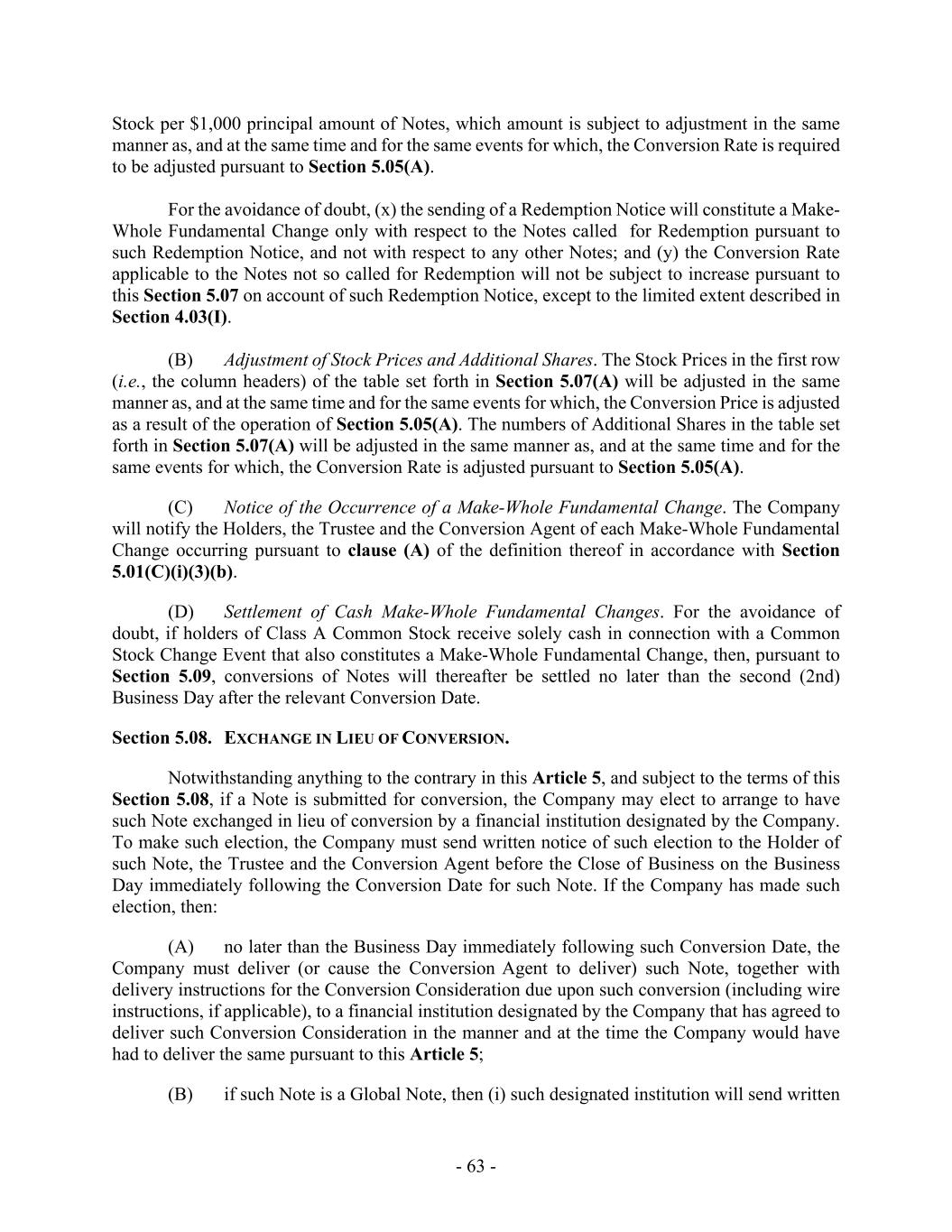 - 63 - Stock per $1,000 principal amount of Notes, which amount is subject to adjustment in the same manner as, and at the same time and for the same events for which, the Conversion Rate is required to be adjusted pursuant to Section 5.05(A). For the avoidance of doubt, (x) the sending of a Redemption Notice will constitute a Make- Whole Fundamental Change only with respect to the Notes called for Redemption pursuant to such Redemption Notice, and not with respect to any other Notes; and (y) the Conversion Rate applicable to the Notes not so called for Redemption will not be subject to increase pursuant to this Section 5.07 on account of such Redemption Notice, except to the limited extent described in Section 4.03(I). (B) Adjustment of Stock Prices and Additional Shares. The Stock Prices in the first row (i.e., the column headers) of the table set forth in Section 5.07(A) will be adjusted in the same manner as, and at the same time and for the same events for which, the Conversion Price is adjusted as a result of the operation of Section 5.05(A). The numbers of Additional Shares in the table set forth in Section 5.07(A) will be adjusted in the same manner as, and at the same time and for the same events for which, the Conversion Rate is adjusted pursuant to Section 5.05(A). (C) Notice of the Occurrence of a Make-Whole Fundamental Change. The Company will notify the Holders, the Trustee and the Conversion Agent of each Make-Whole Fundamental Change occurring pursuant to clause (A) of the definition thereof in accordance with Section 5.01(C)(i)(3)(b). (D) Settlement of Cash Make-Whole Fundamental Changes. For the avoidance of doubt, if holders of Class A Common Stock receive solely cash in connection with a Common Stock Change Event that also constitutes a Make-Whole Fundamental Change, then, pursuant to Section 5.09, conversions of Notes will thereafter be settled no later than the second (2nd) Business Day after the relevant Conversion Date. Section 5.08. EXCHANGE IN LIEU OF CONVERSION. Notwithstanding anything to the contrary in this Article 5, and subject to the terms of this Section 5.08, if a Note is submitted for conversion, the Company may elect to arrange to have such Note exchanged in lieu of conversion by a financial institution designated by the Company. To make such election, the Company must send written notice of such election to the Holder of such Note, the Trustee and the Conversion Agent before the Close of Business on the Business Day immediately following the Conversion Date for such Note. If the Company has made such election, then: (A) no later than the Business Day immediately following such Conversion Date, the Company must deliver (or cause the Conversion Agent to deliver) such Note, together with delivery instructions for the Conversion Consideration due upon such conversion (including wire instructions, if applicable), to a financial institution designated by the Company that has agreed to deliver such Conversion Consideration in the manner and at the time the Company would have had to deliver the same pursuant to this Article 5; (B) if such Note is a Global Note, then (i) such designated institution will send written