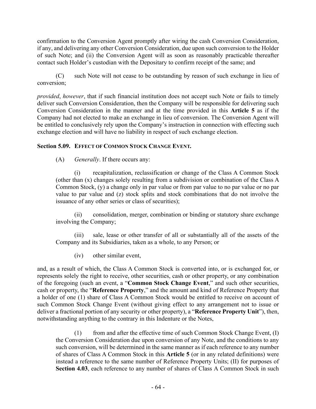 - 64 - confirmation to the Conversion Agent promptly after wiring the cash Conversion Consideration, if any, and delivering any other Conversion Consideration, due upon such conversion to the Holder of such Note; and (ii) the Conversion Agent will as soon as reasonably practicable thereafter contact such Holder’s custodian with the Depositary to confirm receipt of the same; and (C) such Note will not cease to be outstanding by reason of such exchange in lieu of conversion; provided, however, that if such financial institution does not accept such Note or fails to timely deliver such Conversion Consideration, then the Company will be responsible for delivering such Conversion Consideration in the manner and at the time provided in this Article 5 as if the Company had not elected to make an exchange in lieu of conversion. The Conversion Agent will be entitled to conclusively rely upon the Company’s instruction in connection with effecting such exchange election and will have no liability in respect of such exchange election. Section 5.09. EFFECT OF COMMON STOCK CHANGE EVENT. (A) Generally. If there occurs any: (i) recapitalization, reclassification or change of the Class A Common Stock (other than (x) changes solely resulting from a subdivision or combination of the Class A Common Stock, (y) a change only in par value or from par value to no par value or no par value to par value and (z) stock splits and stock combinations that do not involve the issuance of any other series or class of securities); (ii) consolidation, merger, combination or binding or statutory share exchange involving the Company; (iii) sale, lease or other transfer of all or substantially all of the assets of the Company and its Subsidiaries, taken as a whole, to any Person; or (iv) other similar event, and, as a result of which, the Class A Common Stock is converted into, or is exchanged for, or represents solely the right to receive, other securities, cash or other property, or any combination of the foregoing (such an event, a “Common Stock Change Event,” and such other securities, cash or property, the “Reference Property,” and the amount and kind of Reference Property that a holder of one (1) share of Class A Common Stock would be entitled to receive on account of such Common Stock Change Event (without giving effect to any arrangement not to issue or deliver a fractional portion of any security or other property), a “Reference Property Unit”), then, notwithstanding anything to the contrary in this Indenture or the Notes, (1) from and after the effective time of such Common Stock Change Event, (I) the Conversion Consideration due upon conversion of any Note, and the conditions to any such conversion, will be determined in the same manner as if each reference to any number of shares of Class A Common Stock in this Article 5 (or in any related definitions) were instead a reference to the same number of Reference Property Units; (II) for purposes of Section 4.03, each reference to any number of shares of Class A Common Stock in such