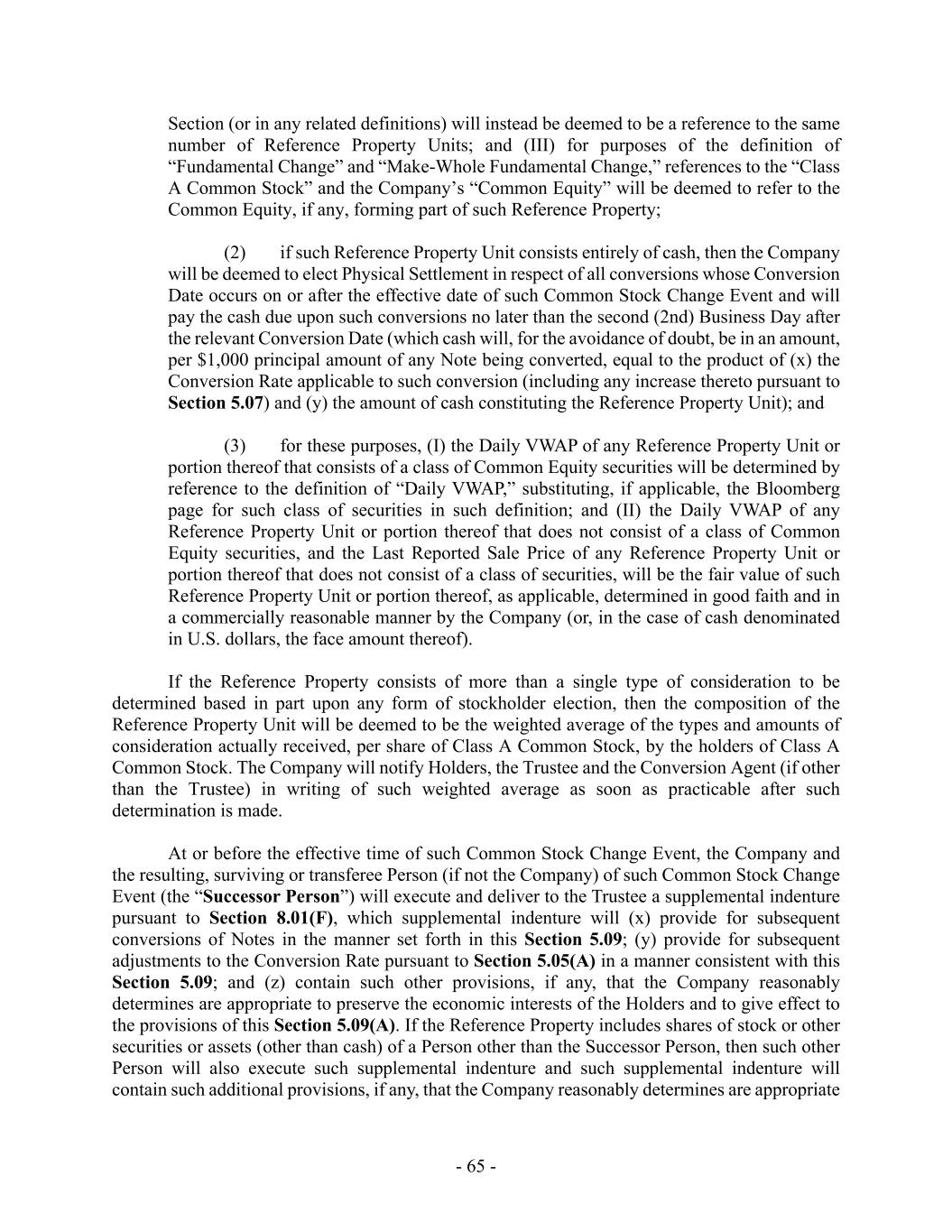 - 65 - Section (or in any related definitions) will instead be deemed to be a reference to the same number of Reference Property Units; and (III) for purposes of the definition of “Fundamental Change” and “Make-Whole Fundamental Change,” references to the “Class A Common Stock” and the Company’s “Common Equity” will be deemed to refer to the Common Equity, if any, forming part of such Reference Property; (2) if such Reference Property Unit consists entirely of cash, then the Company will be deemed to elect Physical Settlement in respect of all conversions whose Conversion Date occurs on or after the effective date of such Common Stock Change Event and will pay the cash due upon such conversions no later than the second (2nd) Business Day after the relevant Conversion Date (which cash will, for the avoidance of doubt, be in an amount, per $1,000 principal amount of any Note being converted, equal to the product of (x) the Conversion Rate applicable to such conversion (including any increase thereto pursuant to Section 5.07) and (y) the amount of cash constituting the Reference Property Unit); and (3) for these purposes, (I) the Daily VWAP of any Reference Property Unit or portion thereof that consists of a class of Common Equity securities will be determined by reference to the definition of “Daily VWAP,” substituting, if applicable, the Bloomberg page for such class of securities in such definition; and (II) the Daily VWAP of any Reference Property Unit or portion thereof that does not consist of a class of Common Equity securities, and the Last Reported Sale Price of any Reference Property Unit or portion thereof that does not consist of a class of securities, will be the fair value of such Reference Property Unit or portion thereof, as applicable, determined in good faith and in a commercially reasonable manner by the Company (or, in the case of cash denominated in U.S. dollars, the face amount thereof). If the Reference Property consists of more than a single type of consideration to be determined based in part upon any form of stockholder election, then the composition of the Reference Property Unit will be deemed to be the weighted average of the types and amounts of consideration actually received, per share of Class A Common Stock, by the holders of Class A Common Stock. The Company will notify Holders, the Trustee and the Conversion Agent (if other than the Trustee) in writing of such weighted average as soon as practicable after such determination is made. At or before the effective time of such Common Stock Change Event, the Company and the resulting, surviving or transferee Person (if not the Company) of such Common Stock Change Event (the “Successor Person”) will execute and deliver to the Trustee a supplemental indenture pursuant to Section 8.01(F), which supplemental indenture will (x) provide for subsequent conversions of Notes in the manner set forth in this Section 5.09; (y) provide for subsequent adjustments to the Conversion Rate pursuant to Section 5.05(A) in a manner consistent with this Section 5.09; and (z) contain such other provisions, if any, that the Company reasonably determines are appropriate to preserve the economic interests of the Holders and to give effect to the provisions of this Section 5.09(A). If the Reference Property includes shares of stock or other securities or assets (other than cash) of a Person other than the Successor Person, then such other Person will also execute such supplemental indenture and such supplemental indenture will contain such additional provisions, if any, that the Company reasonably determines are appropriate