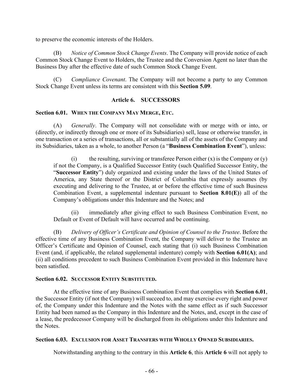 - 66 - to preserve the economic interests of the Holders. (B) Notice of Common Stock Change Events. The Company will provide notice of each Common Stock Change Event to Holders, the Trustee and the Conversion Agent no later than the Business Day after the effective date of such Common Stock Change Event. (C) Compliance Covenant. The Company will not become a party to any Common Stock Change Event unless its terms are consistent with this Section 5.09. Article 6. SUCCESSORS Section 6.01. WHEN THE COMPANY MAY MERGE, ETC. (A) Generally. The Company will not consolidate with or merge with or into, or (directly, or indirectly through one or more of its Subsidiaries) sell, lease or otherwise transfer, in one transaction or a series of transactions, all or substantially all of the assets of the Company and its Subsidiaries, taken as a whole, to another Person (a “Business Combination Event”), unless: (i) the resulting, surviving or transferee Person either (x) is the Company or (y) if not the Company, is a Qualified Successor Entity (such Qualified Successor Entity, the “Successor Entity”) duly organized and existing under the laws of the United States of America, any State thereof or the District of Columbia that expressly assumes (by executing and delivering to the Trustee, at or before the effective time of such Business Combination Event, a supplemental indenture pursuant to Section 8.01(E)) all of the Company’s obligations under this Indenture and the Notes; and (ii) immediately after giving effect to such Business Combination Event, no Default or Event of Default will have occurred and be continuing. (B) Delivery of Officer’s Certificate and Opinion of Counsel to the Trustee. Before the effective time of any Business Combination Event, the Company will deliver to the Trustee an Officer’s Certificate and Opinion of Counsel, each stating that (i) such Business Combination Event (and, if applicable, the related supplemental indenture) comply with Section 6.01(A); and (ii) all conditions precedent to such Business Combination Event provided in this Indenture have been satisfied. Section 6.02. SUCCESSOR ENTITY SUBSTITUTED. At the effective time of any Business Combination Event that complies with Section 6.01, the Successor Entity (if not the Company) will succeed to, and may exercise every right and power of, the Company under this Indenture and the Notes with the same effect as if such Successor Entity had been named as the Company in this Indenture and the Notes, and, except in the case of a lease, the predecessor Company will be discharged from its obligations under this Indenture and the Notes. Section 6.03. EXCLUSION FOR ASSET TRANSFERS WITH WHOLLY OWNED SUBSIDIARIES. Notwithstanding anything to the contrary in this Article 6, this Article 6 will not apply to