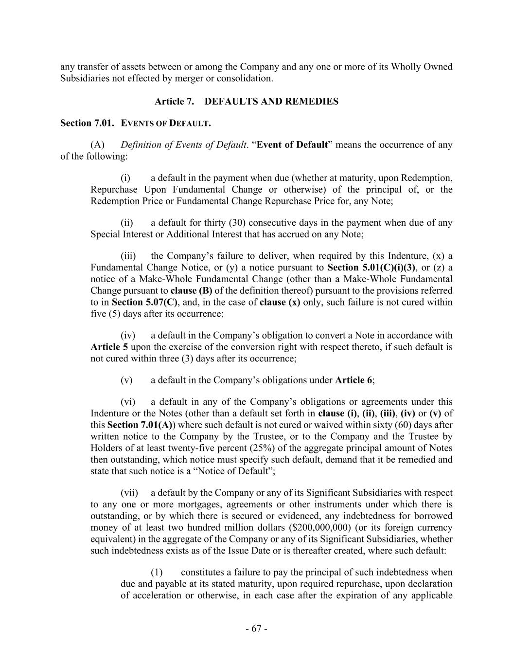 - 67 - any transfer of assets between or among the Company and any one or more of its Wholly Owned Subsidiaries not effected by merger or consolidation. Article 7. DEFAULTS AND REMEDIES Section 7.01. EVENTS OF DEFAULT. (A) Definition of Events of Default. “Event of Default” means the occurrence of any of the following: (i) a default in the payment when due (whether at maturity, upon Redemption, Repurchase Upon Fundamental Change or otherwise) of the principal of, or the Redemption Price or Fundamental Change Repurchase Price for, any Note; (ii) a default for thirty (30) consecutive days in the payment when due of any Special Interest or Additional Interest that has accrued on any Note; (iii) the Company’s failure to deliver, when required by this Indenture, (x) a Fundamental Change Notice, or (y) a notice pursuant to Section 5.01(C)(i)(3), or (z) a notice of a Make-Whole Fundamental Change (other than a Make-Whole Fundamental Change pursuant to clause (B) of the definition thereof) pursuant to the provisions referred to in Section 5.07(C), and, in the case of clause (x) only, such failure is not cured within five (5) days after its occurrence; (iv) a default in the Company’s obligation to convert a Note in accordance with Article 5 upon the exercise of the conversion right with respect thereto, if such default is not cured within three (3) days after its occurrence; (v) a default in the Company’s obligations under Article 6; (vi) a default in any of the Company’s obligations or agreements under this Indenture or the Notes (other than a default set forth in clause (i), (ii), (iii), (iv) or (v) of this Section 7.01(A)) where such default is not cured or waived within sixty (60) days after written notice to the Company by the Trustee, or to the Company and the Trustee by Holders of at least twenty-five percent (25%) of the aggregate principal amount of Notes then outstanding, which notice must specify such default, demand that it be remedied and state that such notice is a “Notice of Default”; (vii) a default by the Company or any of its Significant Subsidiaries with respect to any one or more mortgages, agreements or other instruments under which there is outstanding, or by which there is secured or evidenced, any indebtedness for borrowed money of at least two hundred million dollars ($200,000,000) (or its foreign currency equivalent) in the aggregate of the Company or any of its Significant Subsidiaries, whether such indebtedness exists as of the Issue Date or is thereafter created, where such default: (1) constitutes a failure to pay the principal of such indebtedness when due and payable at its stated maturity, upon required repurchase, upon declaration of acceleration or otherwise, in each case after the expiration of any applicable