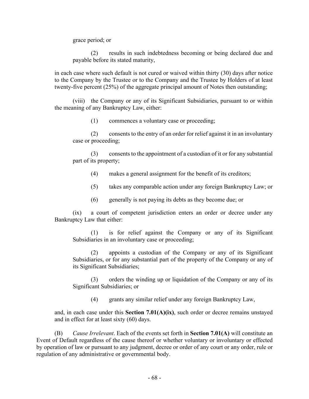 - 68 - grace period; or (2) results in such indebtedness becoming or being declared due and payable before its stated maturity, in each case where such default is not cured or waived within thirty (30) days after notice to the Company by the Trustee or to the Company and the Trustee by Holders of at least twenty-five percent (25%) of the aggregate principal amount of Notes then outstanding; (viii) the Company or any of its Significant Subsidiaries, pursuant to or within the meaning of any Bankruptcy Law, either: (1) commences a voluntary case or proceeding; (2) consents to the entry of an order for relief against it in an involuntary case or proceeding; (3) consents to the appointment of a custodian of it or for any substantial part of its property; (4) makes a general assignment for the benefit of its creditors; (5) takes any comparable action under any foreign Bankruptcy Law; or (6) generally is not paying its debts as they become due; or (ix) a court of competent jurisdiction enters an order or decree under any Bankruptcy Law that either: (1) is for relief against the Company or any of its Significant Subsidiaries in an involuntary case or proceeding; (2) appoints a custodian of the Company or any of its Significant Subsidiaries, or for any substantial part of the property of the Company or any of its Significant Subsidiaries; (3) orders the winding up or liquidation of the Company or any of its Significant Subsidiaries; or (4) grants any similar relief under any foreign Bankruptcy Law, and, in each case under this Section 7.01(A)(ix), such order or decree remains unstayed and in effect for at least sixty (60) days. (B) Cause Irrelevant. Each of the events set forth in Section 7.01(A) will constitute an Event of Default regardless of the cause thereof or whether voluntary or involuntary or effected by operation of law or pursuant to any judgment, decree or order of any court or any order, rule or regulation of any administrative or governmental body.